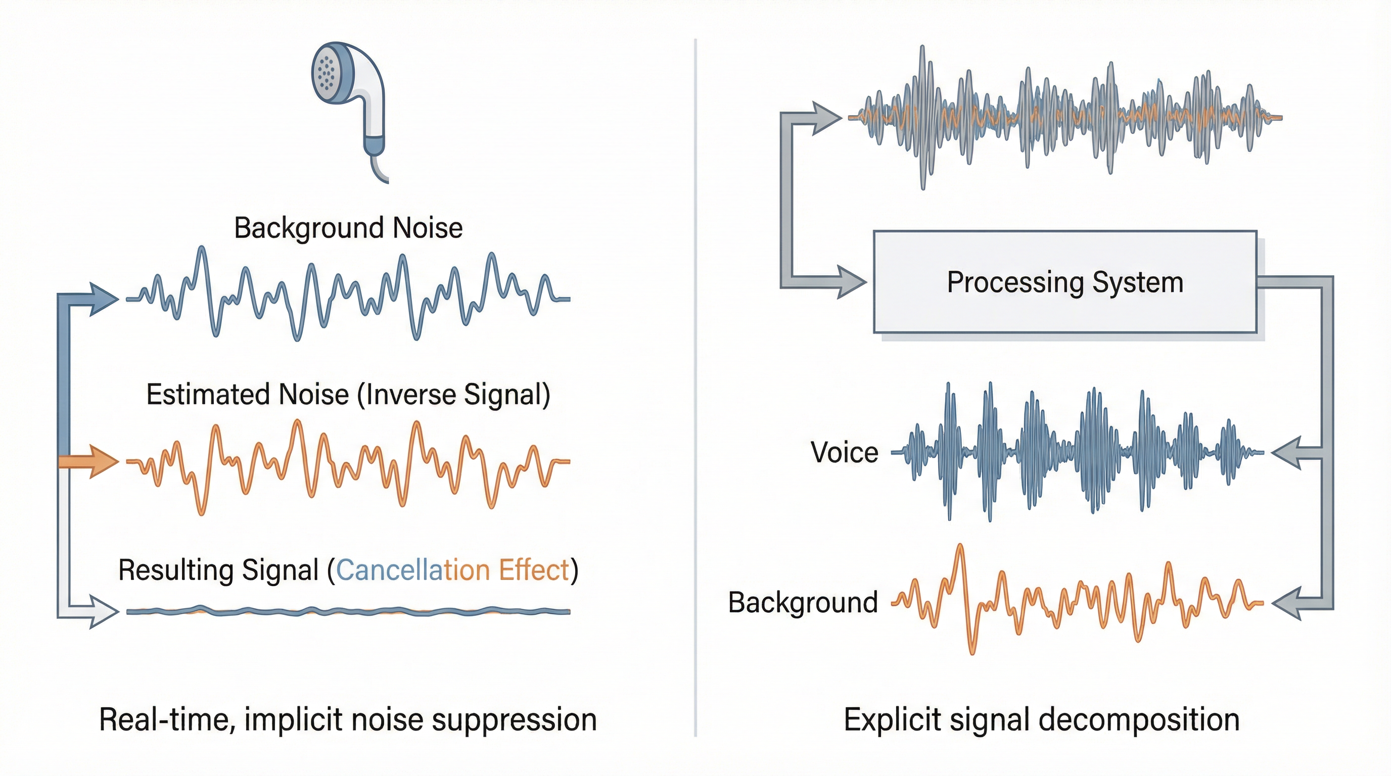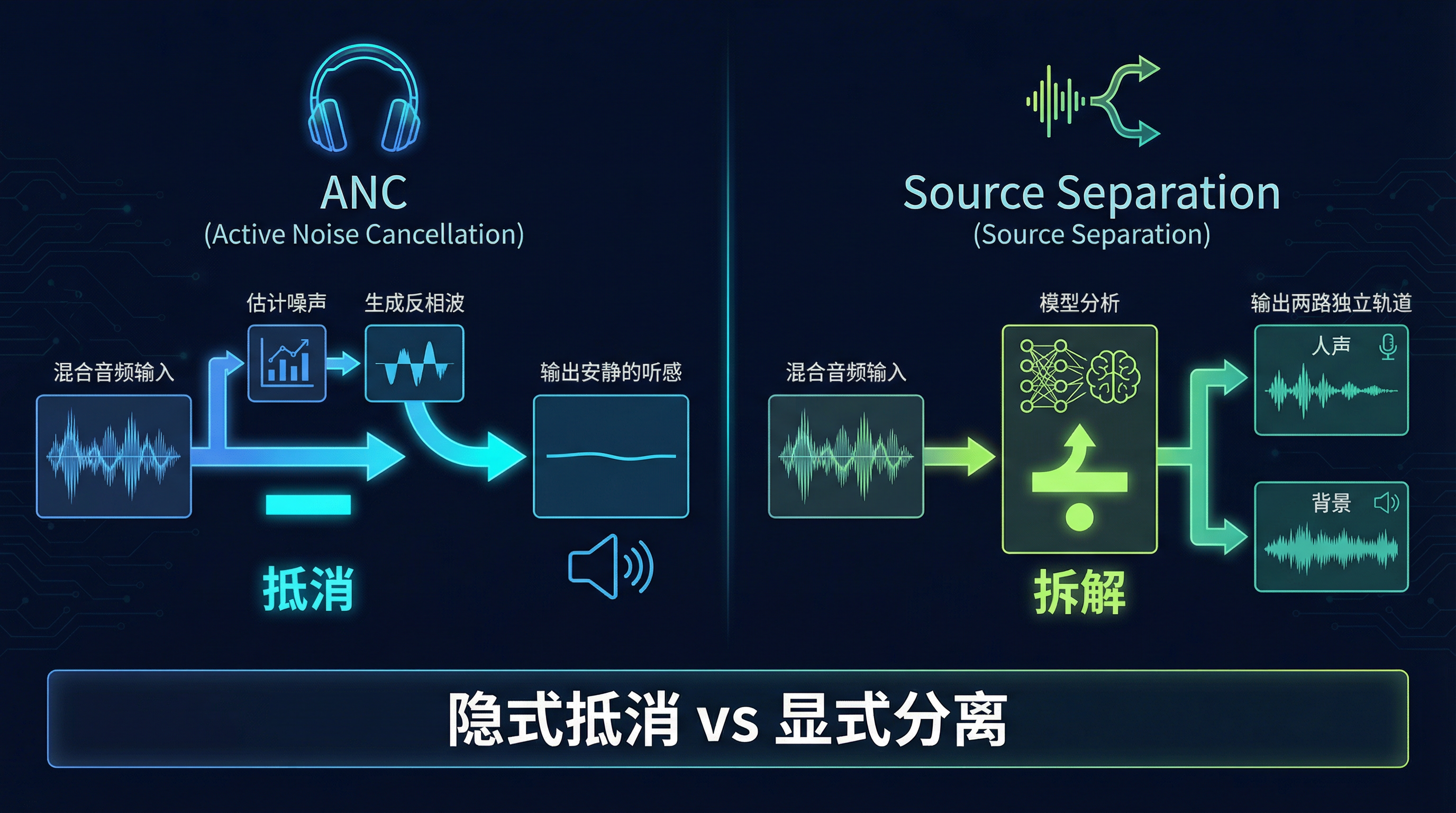 | 核心操作 | 估计噪声 → 反相抵消 | 建模信号 → 分轨输出 |
