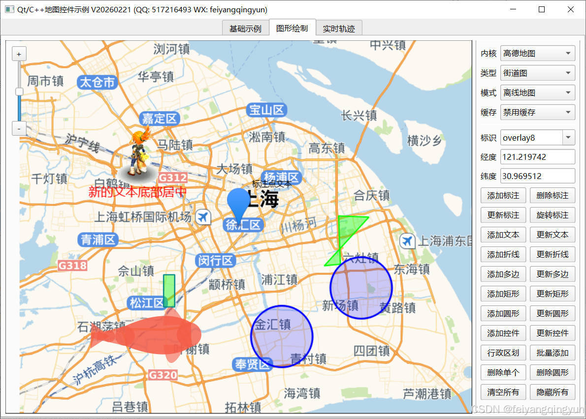 - 支持将QWidget对象作为覆盖物添加到地图控件中,跟随地图移动位置,极大提高灵活性,比如可以将自定义控件直接作为地图控件的子对象加入进去。