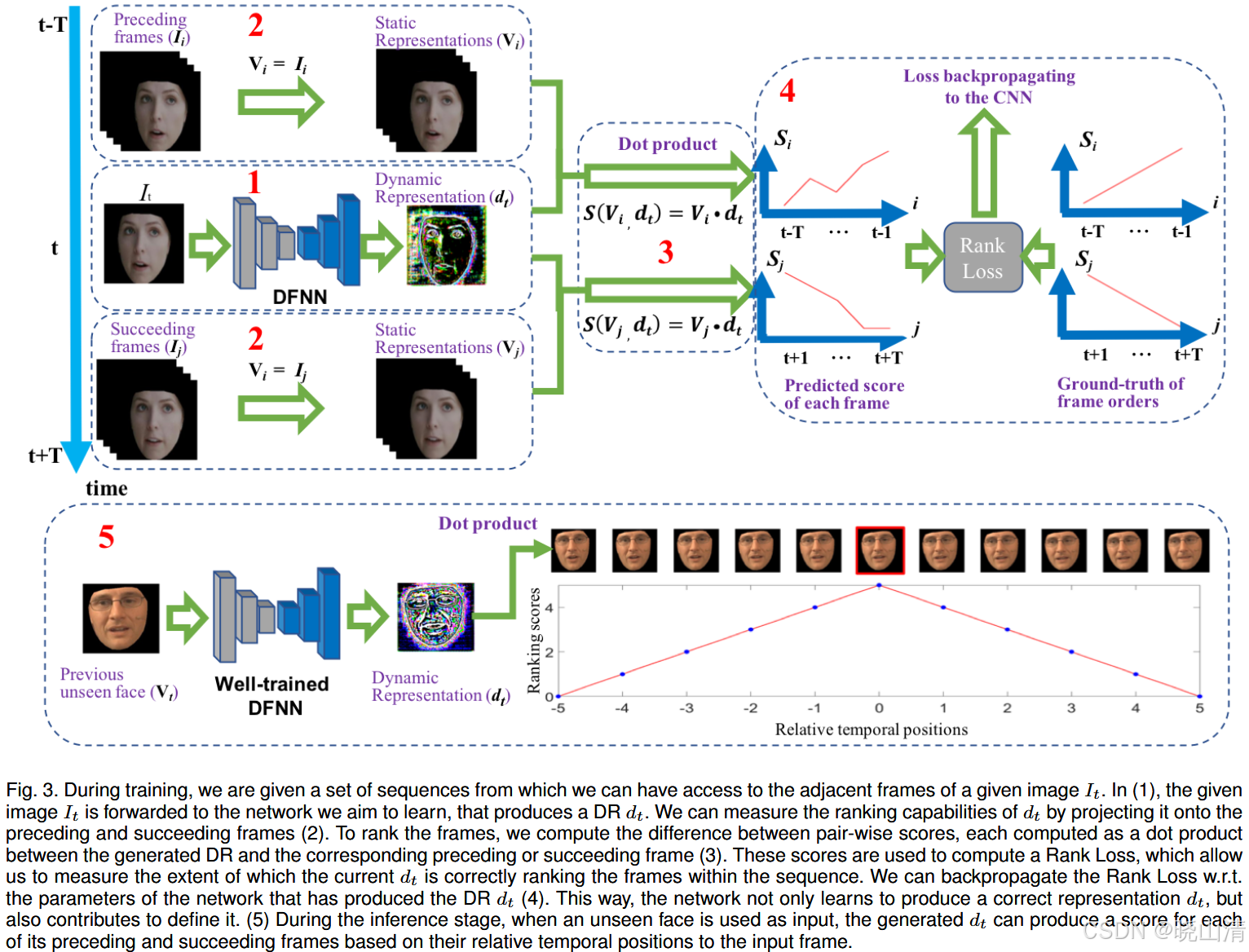 我们的自监督学习任务定义为学习一个具有参数θ的网络 f ( ⋅ , θ ) f(·, θ) f(⋅,θ),该网络仅从单个图像 I t I_t It输入生成动态表示(DR) d t ∈ R m × n d_t \in \mathbb R^{m\times n} dt∈Rm×n。DR的任务是从 I t I_t It的相邻帧中编码时间信息,能够根据其相对于 I t I_t It的相对时间距离对前后帧进行排序。帧的排序通过为每帧分配一个分数来完成,该分数 S ( d t , V a ) S(d_t, V_a) S(dt,Va)定义为DR d t d_t dt与图像 V a V_a Va之间的弗罗贝尼乌斯内积 ⟨ d t , V a ⟩ \langle d_t, V_a\rangle ⟨dt,Va⟩。然后,这些分数以序数方式用于对给定窗口内的帧进行排序。具体来说,我们感兴趣的是为a < t的帧分配递增分数,为a > t的帧分配递减分数。这样,我们可以定义在时间a和b处计算的分数之间的差异为 δ a b ( t ) = S ( d t , V a ) − S ( d t , V b ) δ_{ab}(t) = S(d_t, V_a) − S(d_t, V_b) δab(t)=S(dt,Va)−S(dt,Vb),其中a被选为比b更接近t,且a和b均为t之前的帧或t之后的帧。即目标为: d t 使 δ a b ( t ) > 0 , { ∣ a − t ∣ < ∣ b − t ∣ ( a − t ) ( b − t ) > 0 d_t使δ_{ab}(t)>0, \begin{cases}|a − t| < |b − t|\\ (a − t)(b − t) > 0\end{cases} dt使δab(t)>0,{∣a−t∣<∣b−t∣(a−t)(b−t)>0。我们只会在对(a, b)排序错误的情况下( δ a b ( t ) < 0 δ_{ab}(t)< 0 δab(t)<0)考虑 δ a b ( t ) δ_{ab}(t) δab(t)的实际值。