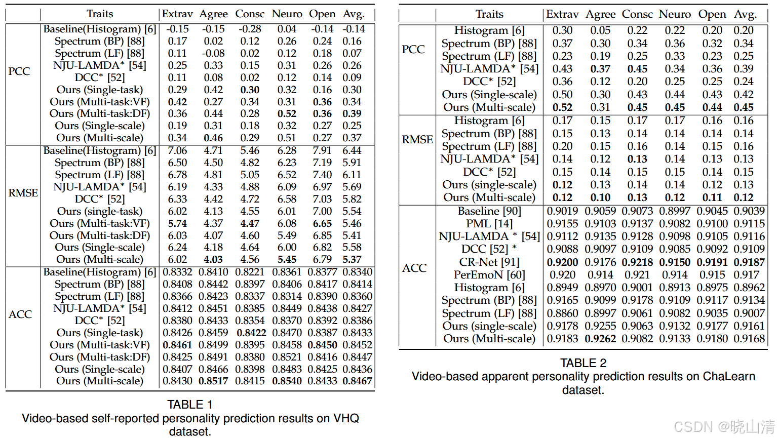 因此:自我报告人格实验:VHQ数据集。表观人格实验:ChaLearn数据集。