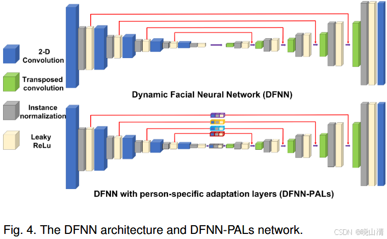 本文选择U-Net网络(我们将其命名为动态面部神经网络DFNN)计算 f ( ⋅ , θ ) f(·, θ) f(⋅,θ),这是一个具有多层跳跃连接的5层编码器-解码器网络(见图4)。编码器包含五个模块,每个模块由一个二维卷积层、一个实例归一化层和一个Leaky ReLU激活函数组成。解码器也包含五个模块。解码器中的每个模块包含一个转置卷积层、一个实例归一化层和Leaky ReLU中。所有五个编码器-解码器层对都通过跳跃连接相连。