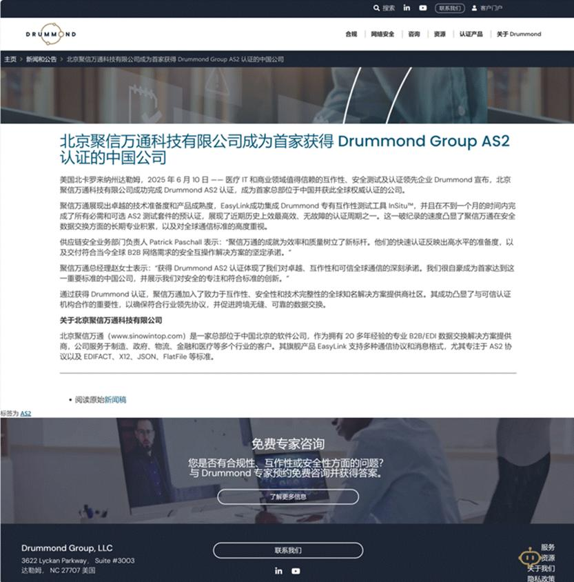图:2025 2Q Drummond Group AS2国际认证新闻稿翻译截图