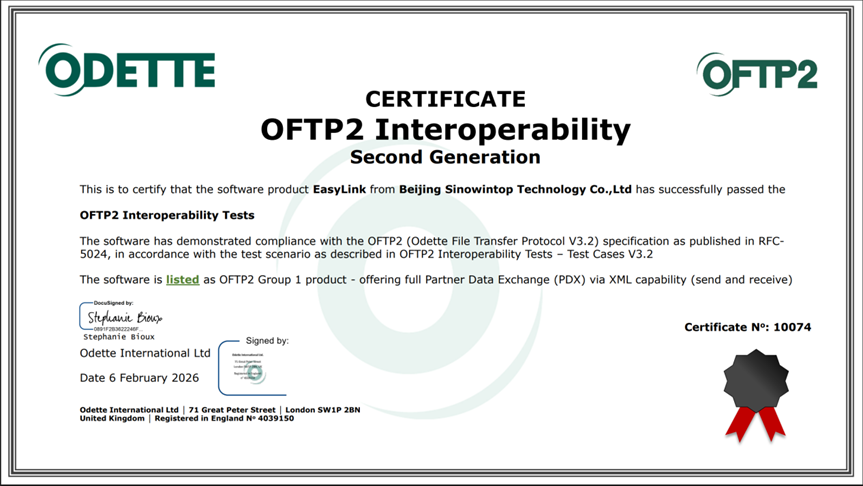 图:2026年2月6日通过OdetteOFTP2国际认证的证书