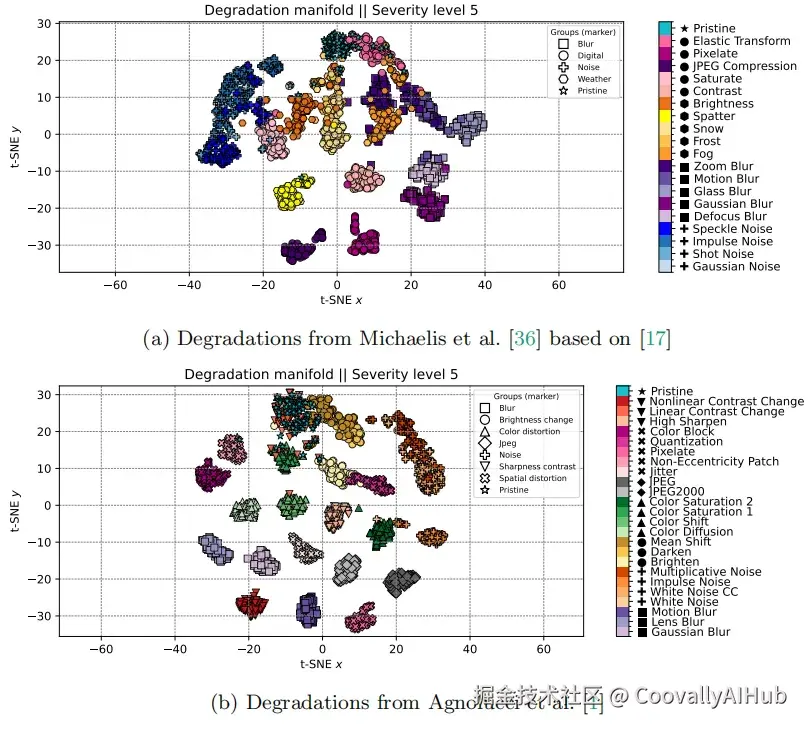 从t-SNE可视化结果中可以清楚地看到,不同类型的退化图像在嵌入空间中形成了明显的聚类。高斯模糊、运动模糊、噪声、JPEG压缩......每一种都有自己独特的"领地"。而干净图像则紧凑地聚集在一起,无论它们来自哪个数据集。