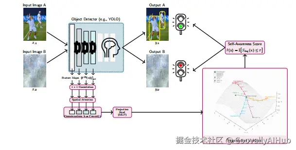 这种情境下,我们需要的不再是预测结果的可靠性,而是对输入本身质量的评估。换句话说,我们需要一个专门负责"检查输入质量"的模块,与原有的检测器并行工作。