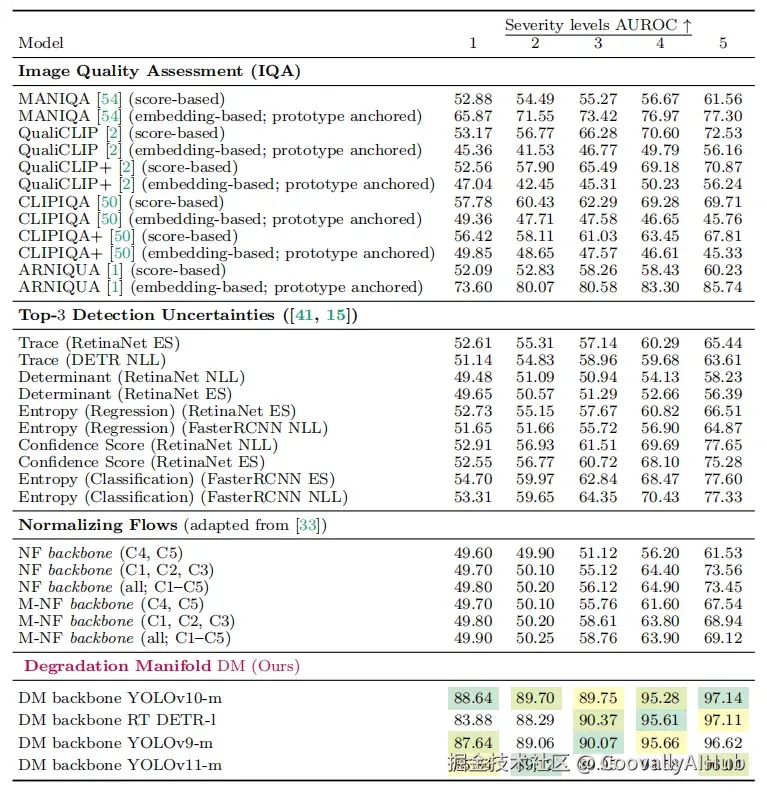 实验结果表明,这种方法确实能有效区分干净图像和退化图像。在COCO数据集上的测试中,该方法在不同退化程度下都取得了优异的AUROC分数(一种衡量分类性能的指标)。尤其值得一提的是,当退化程度达到5级时,AUROC可以超过97%。