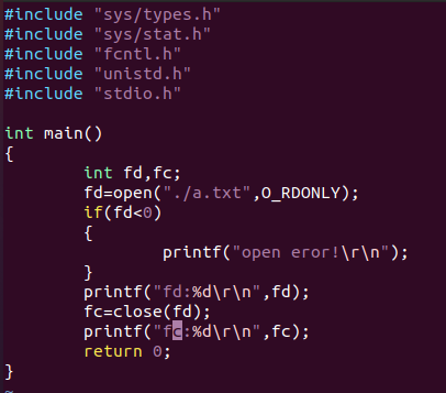 解释一下,这里是主要验证的是open,close函数的使用,主要是以只读的形式打开a.txt文件。如果打开成功,则返回相应的文件描述符(fd)。如果失败则返回-1。当然,我这里也有一个Bug,那就是如果打开失败的话就会返回-1给文件描述符fd,那这样的话下面的close函数也会使用的-1的文件描述符,这样可能会出现报错。所以说我这个是在理想的情况下输出的结果,也就是当a.txt文件存在的时候。注意,如果用户仅仅是打开某个文件而不关闭的话,这在一定程度上会占用系统资源,造成不必要的浪费。所以这两个函数一个放在一起使用。