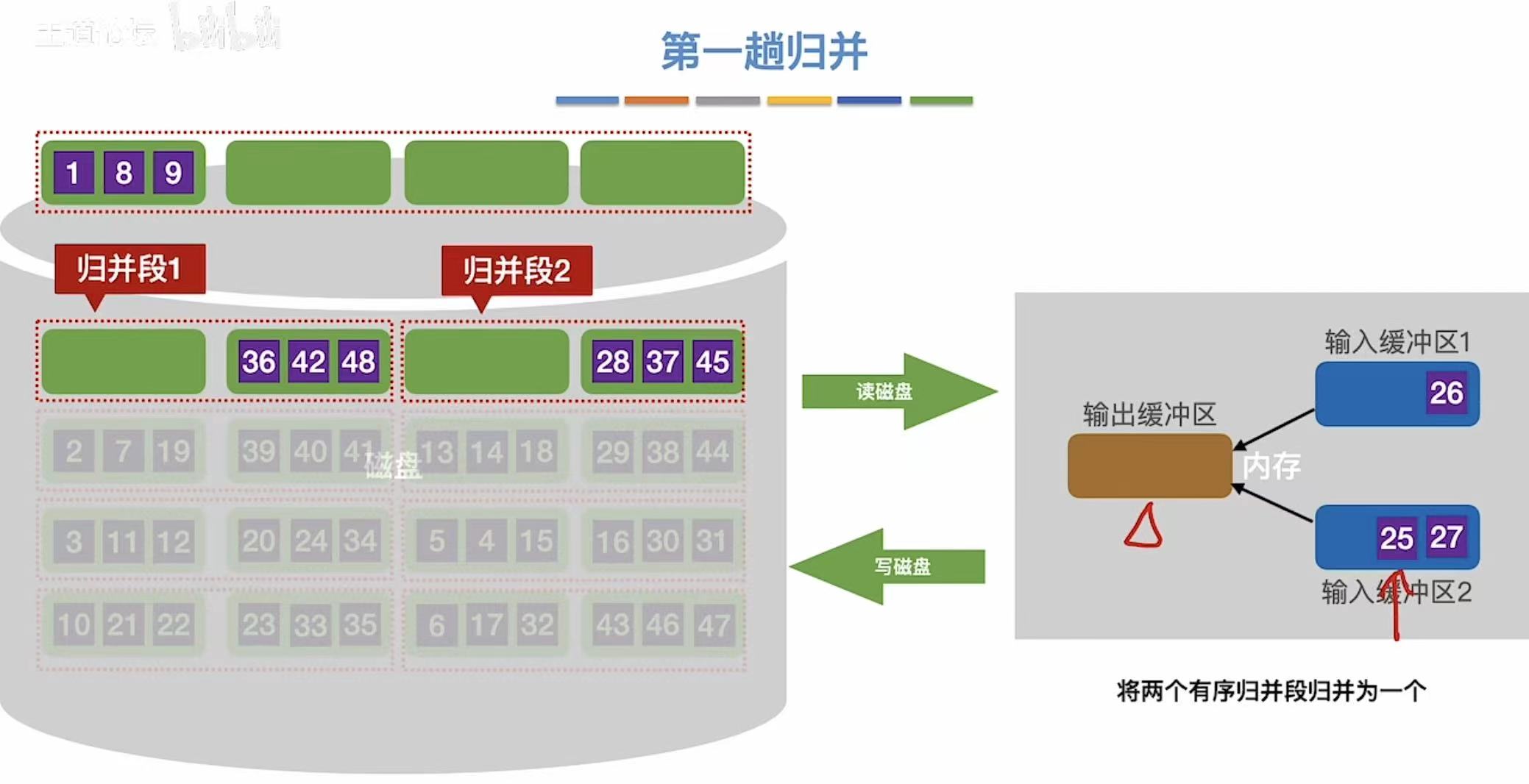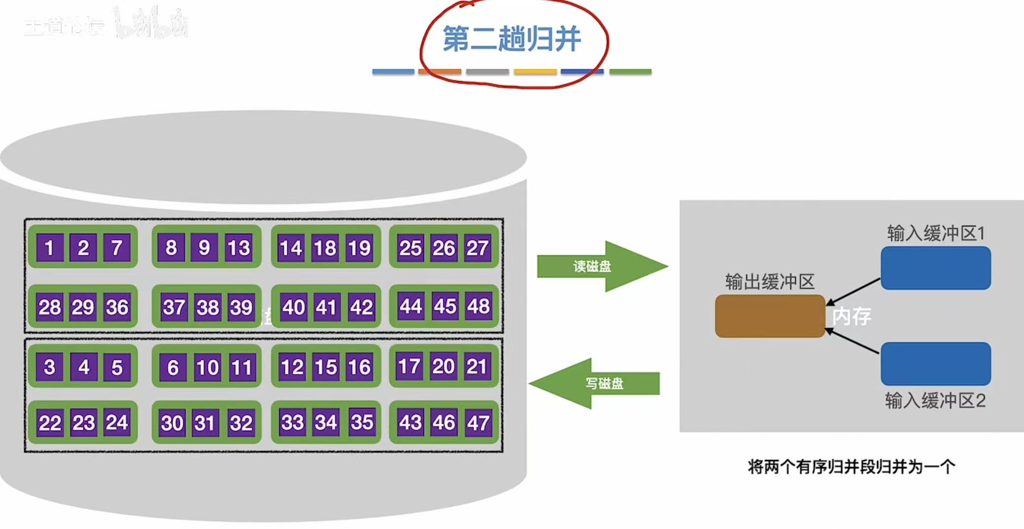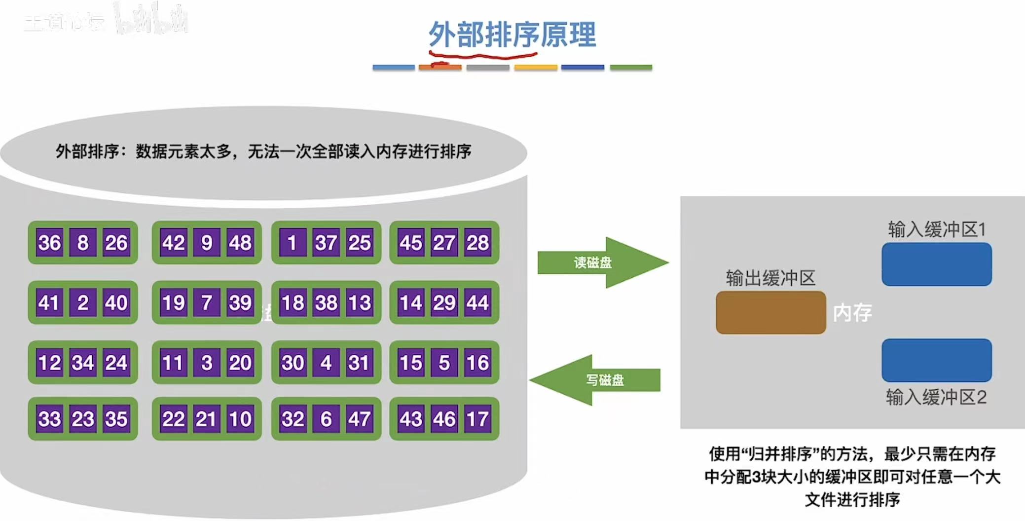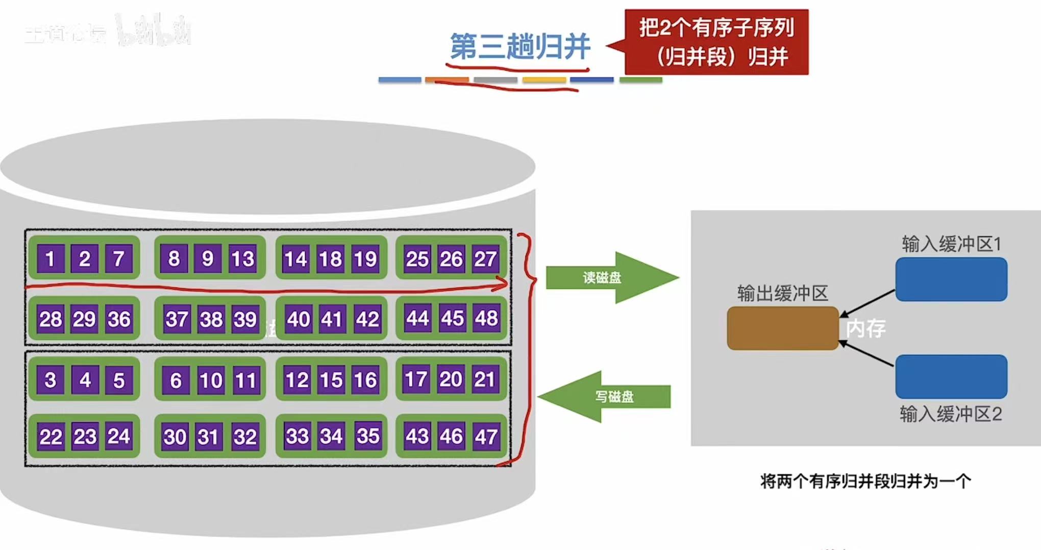 逻辑 :外存-->读出数据-->内存-->在内存有序排列数据(比如一个块三个数据632排成236)-->写回外存