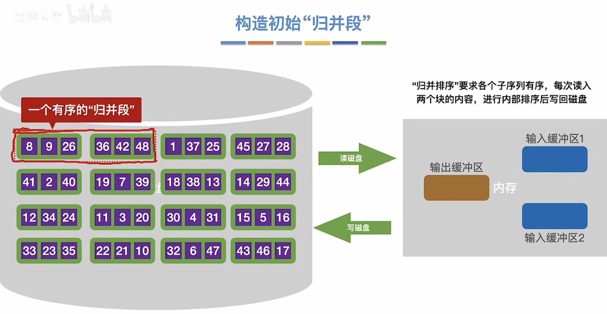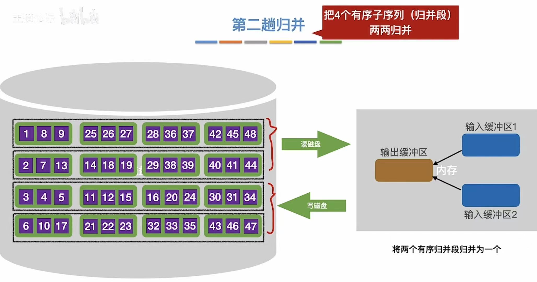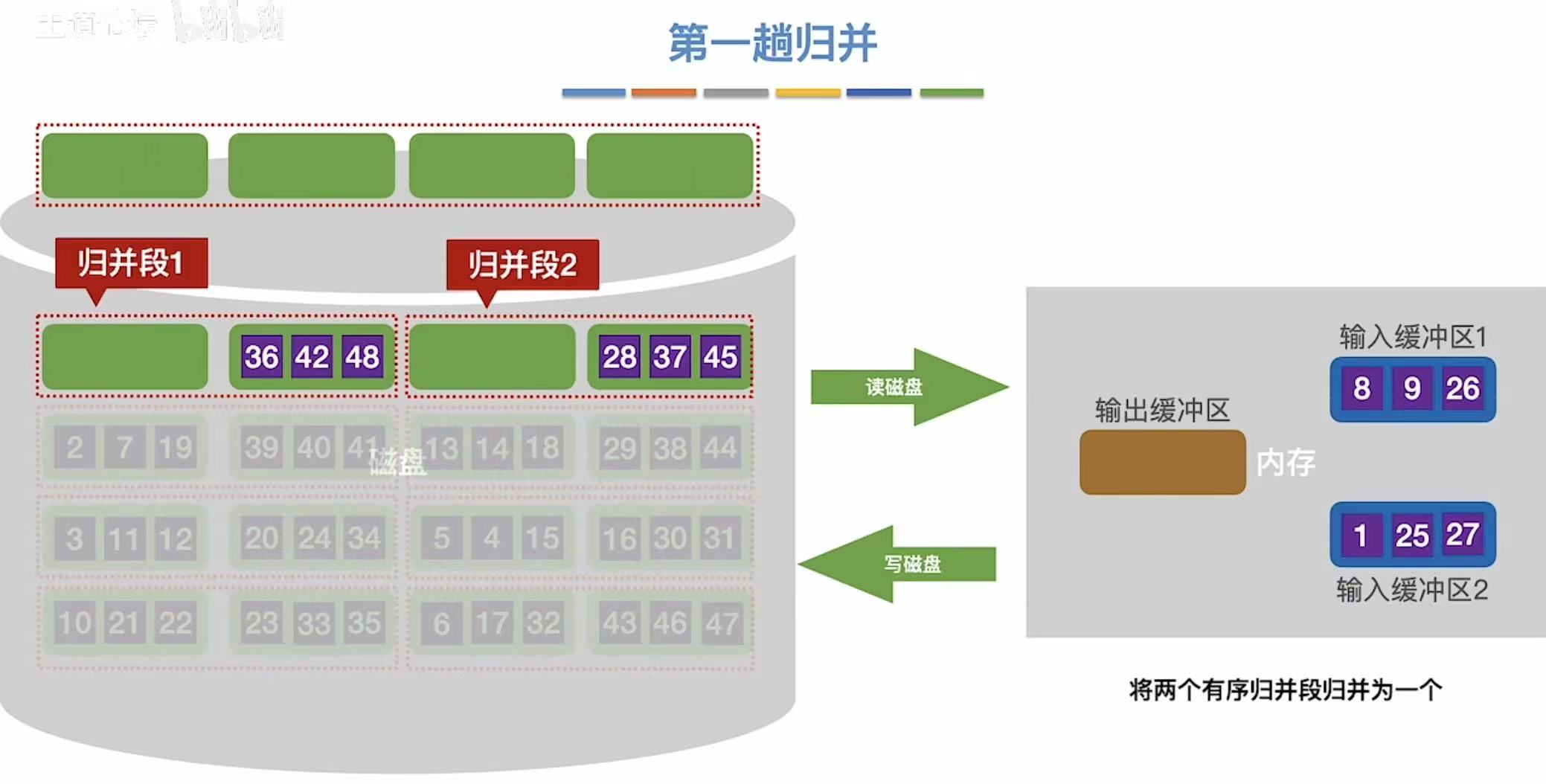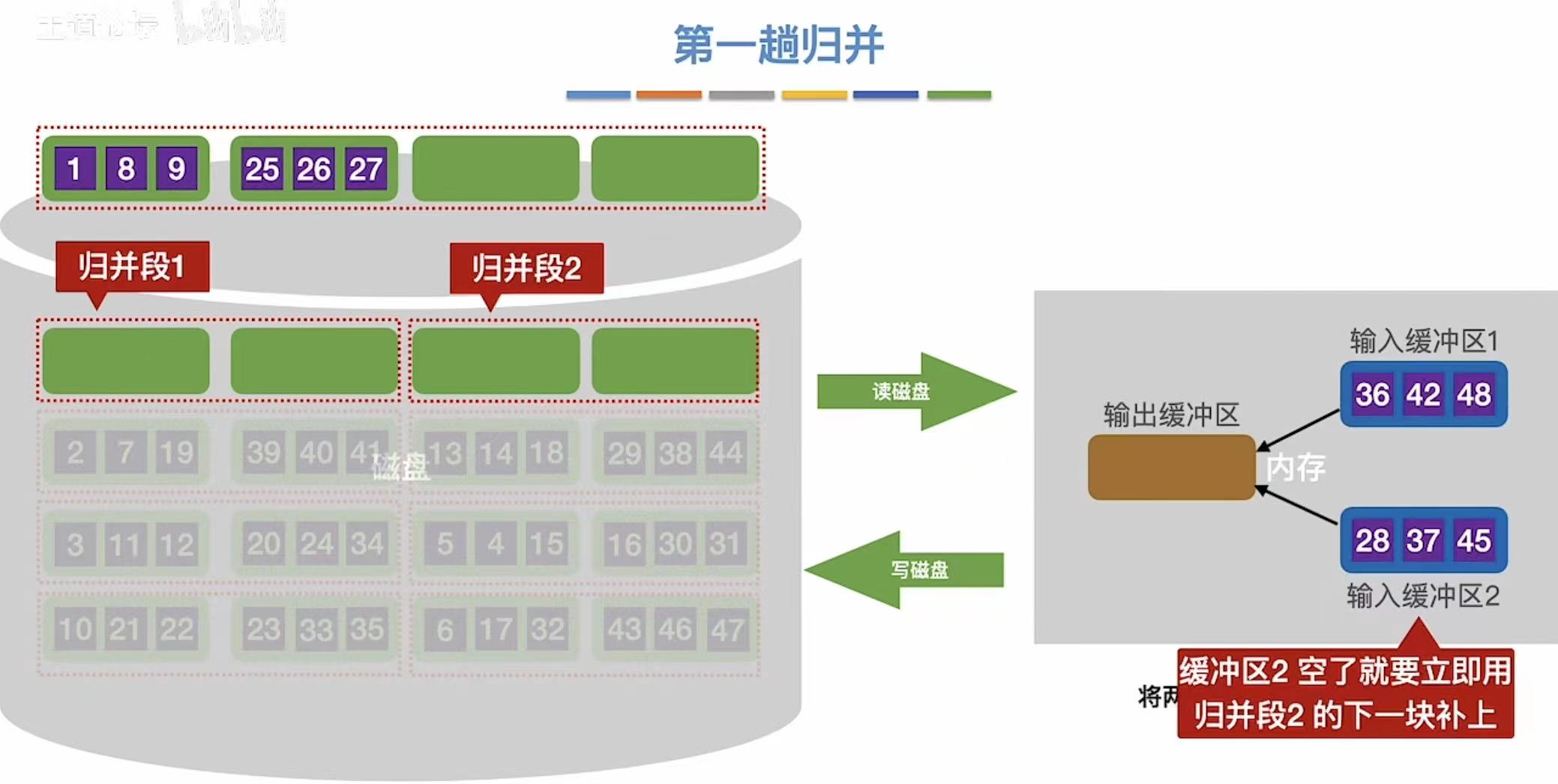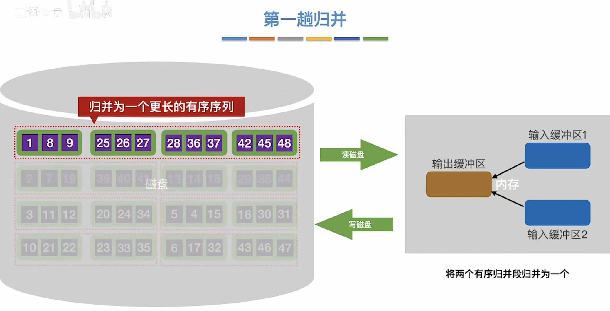 逻辑 :外存-->读出数据-->内存-->在内存有序排列数据(比如一个块三个数据632排成236)-->写回外存