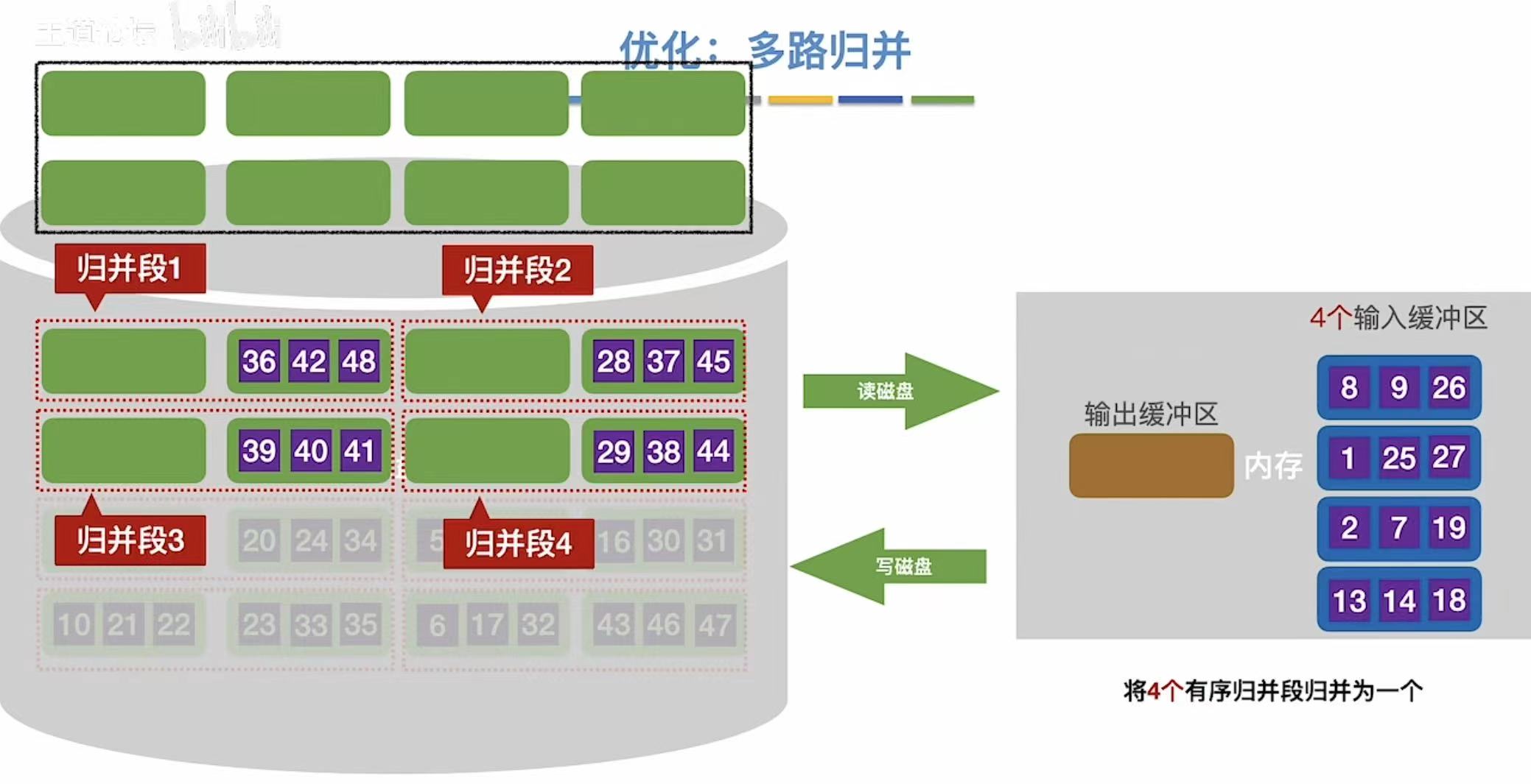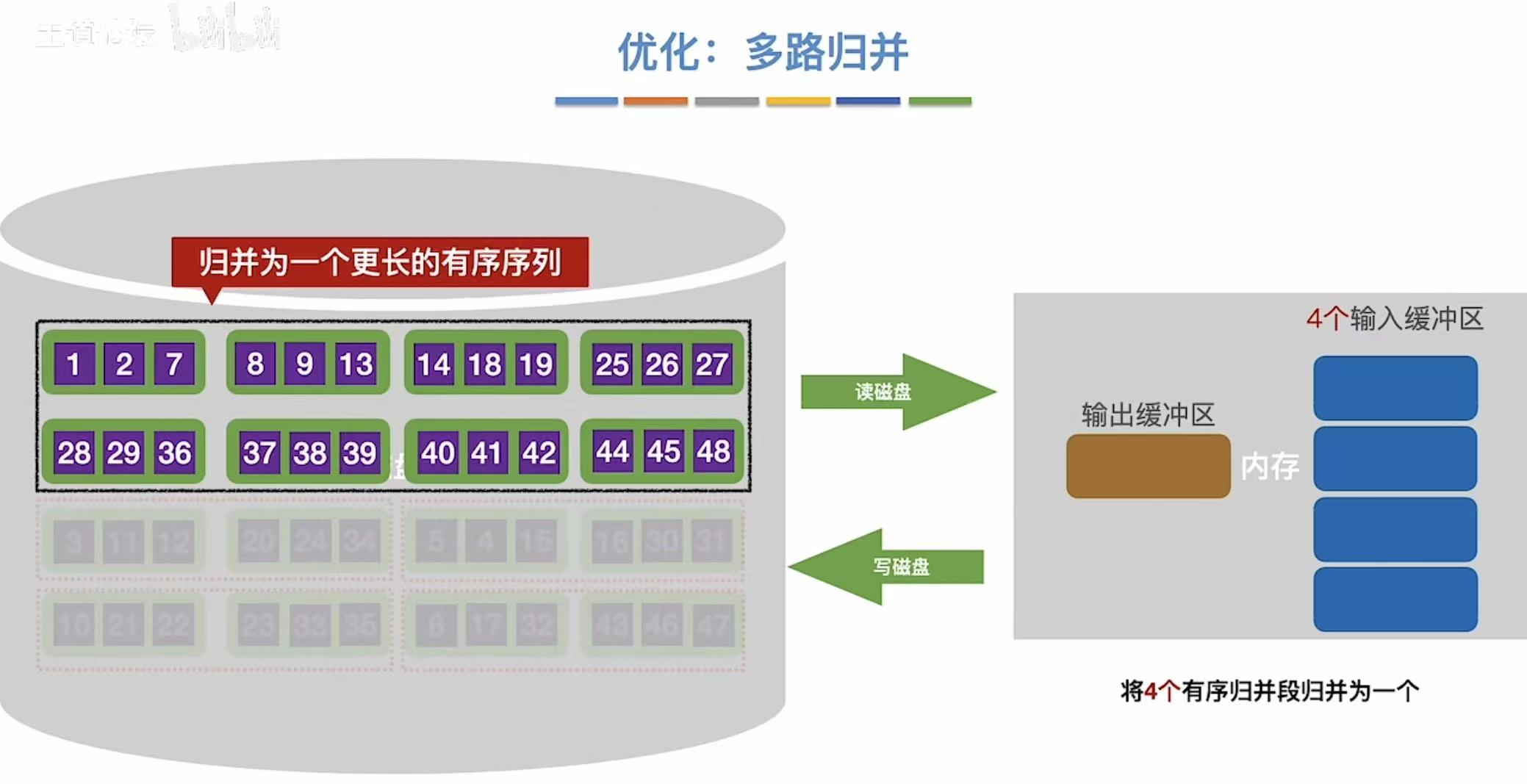 我们可以在内存多申请几个输入缓冲区,实现多路归并,一次读入两个数据段和一次读入四个数据段,当然是后者I/O次数更小,还可以减少归并的趟数。