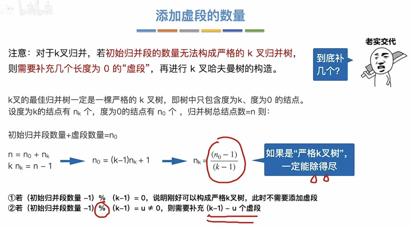 如果减少一个归并段,那么单纯地按照哈夫曼树的逻辑处理得到的就不是最佳归并树了:
