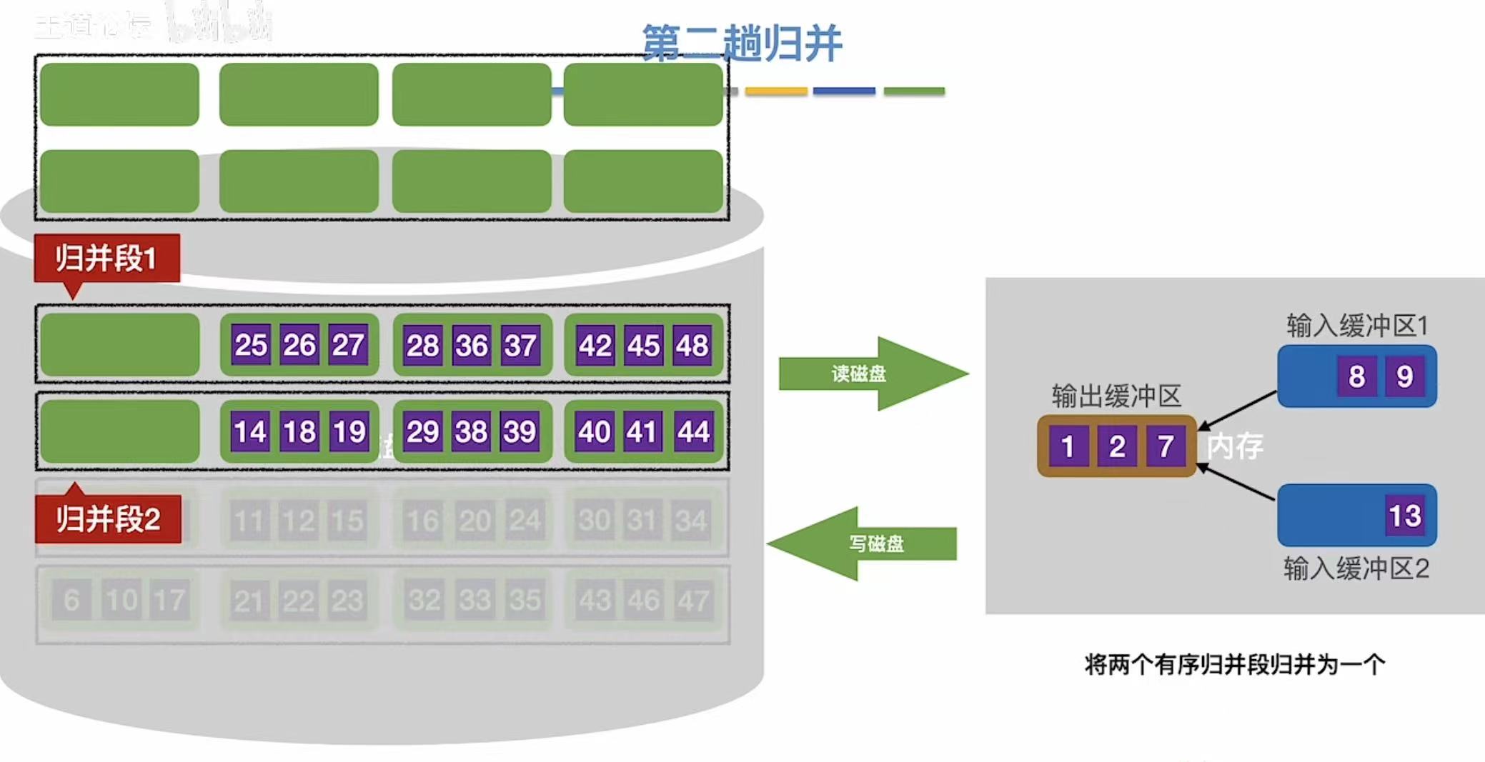 因为内存腾出了两个存放数据块的位置(输入缓冲区)和写出数据的位置(输出缓冲区),2-->1,二合一就是二路归并