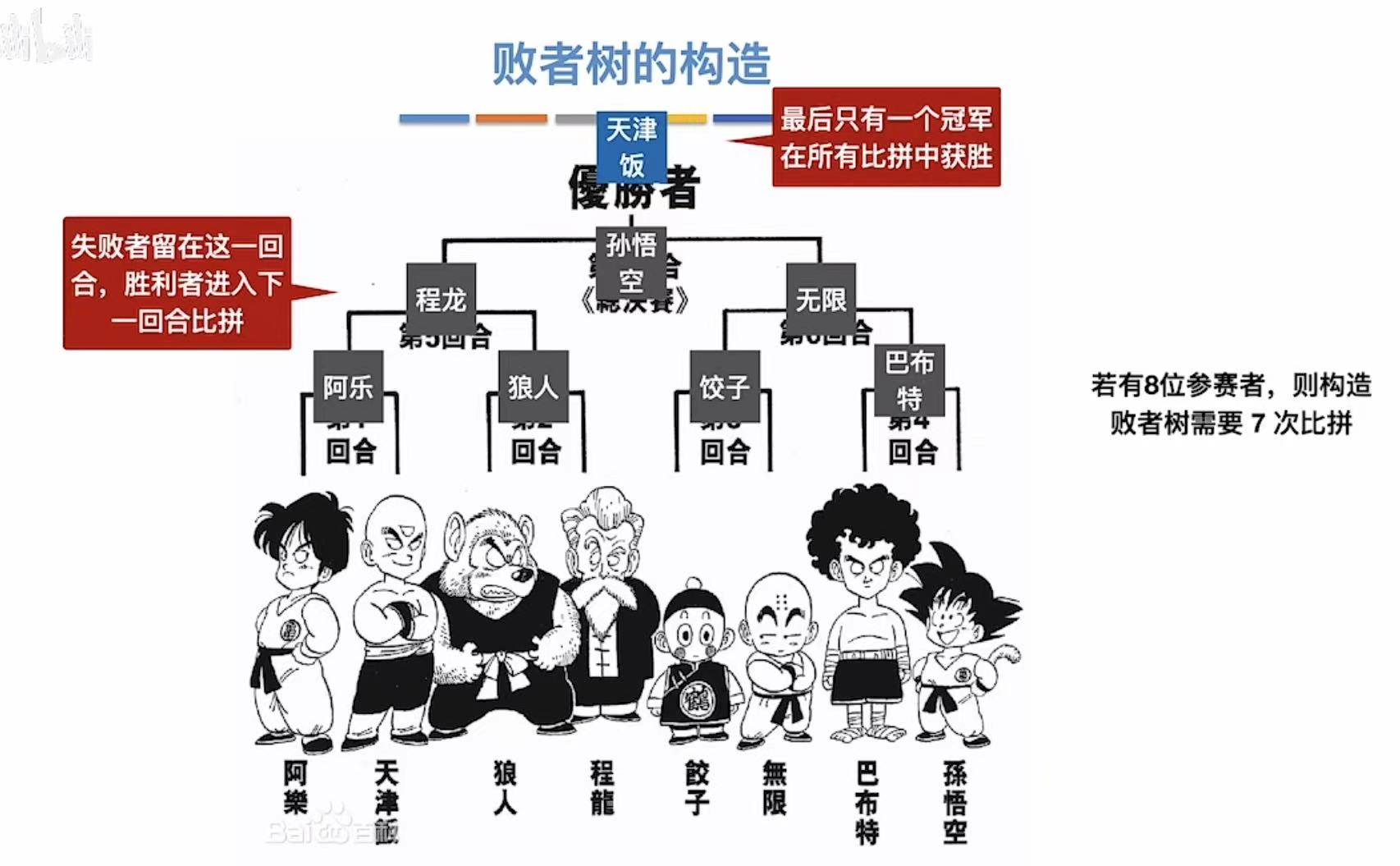 就是两个人战斗,失败的留下,胜利的上去,继续和另一组胜利的人继续比,最终选出一个冠军。