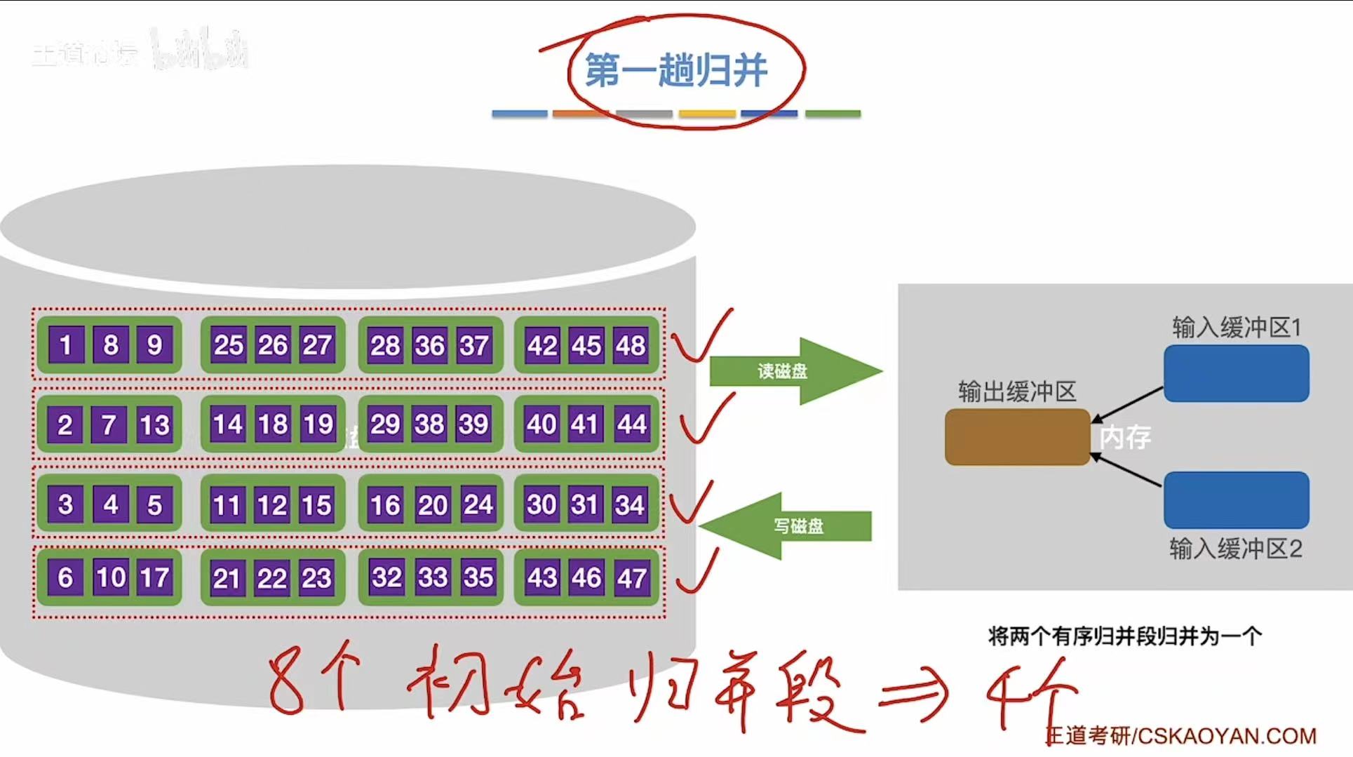 经过16次读和16次写,外存就变成了左边的8个归并段