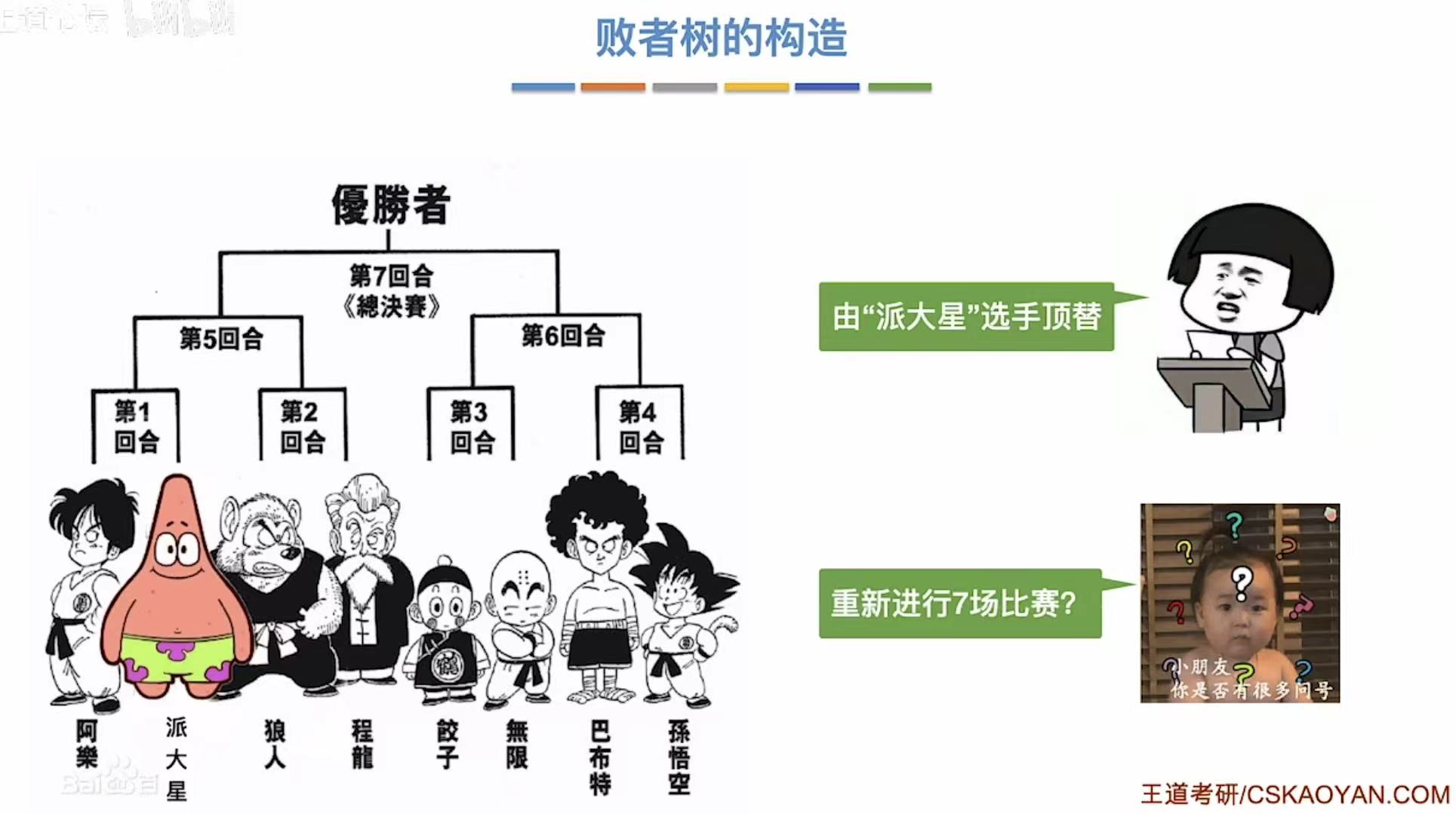 而派大星需要代替天津饭,先和阿乐比,赢了再和程龙比,赢了再和孙悟空比;