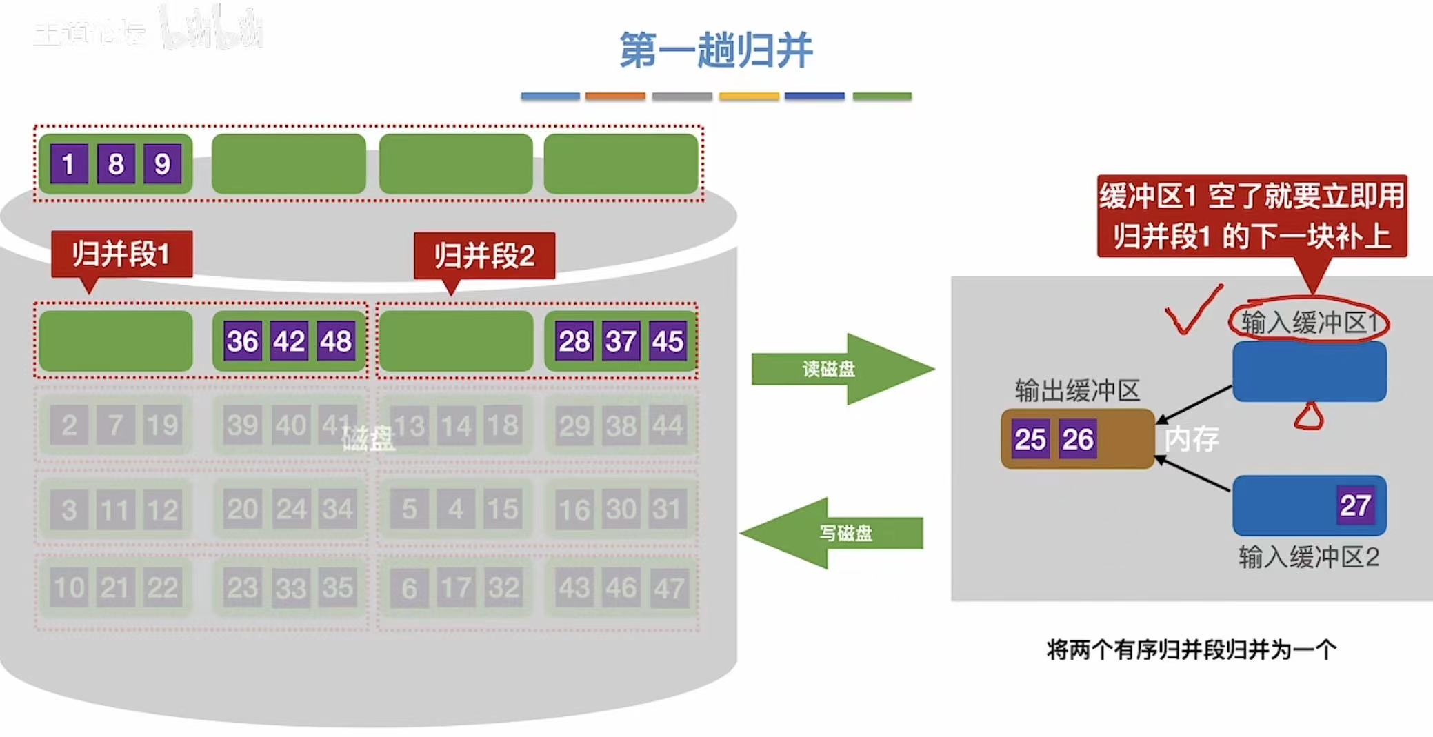 出现一整个缓冲区空白的情况,就继续读入一个数据块,然后继续进行归并排序: