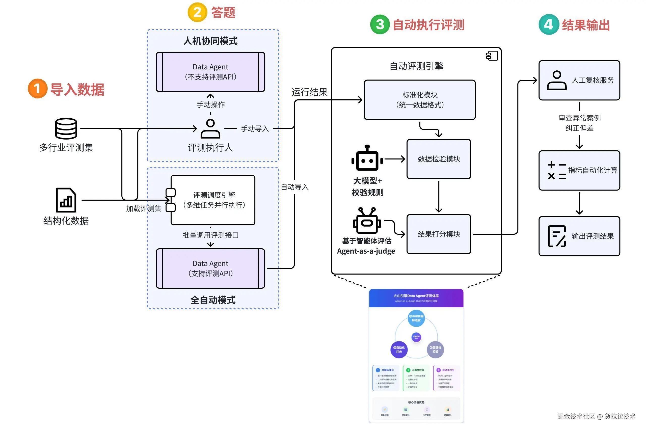 通过多行业/结构化数据输入,经人机协同或全自动(批量调用接口)两种模式答题,再通过自动评测引擎的标准化模块、数据检验模块等模块执行评测,最后经人工复核异常案例、自动计算指标后输出评测结果(来源:https://mp.weixin.qq.com/s/s2SKbOb8nqqKLVuhb-HwLQ)