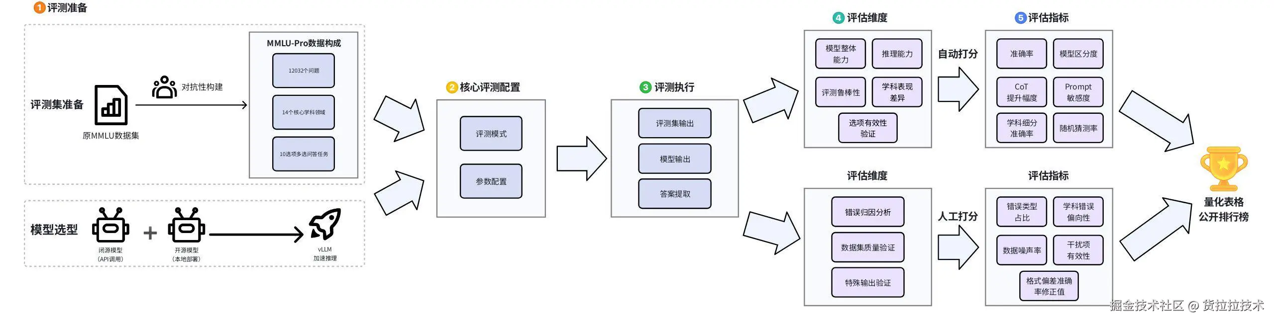 MMLU Pro的评估流程是通过自动打分和人工打分的多指标评估,最终输出量化表格与公开排行榜的完整闭环流程