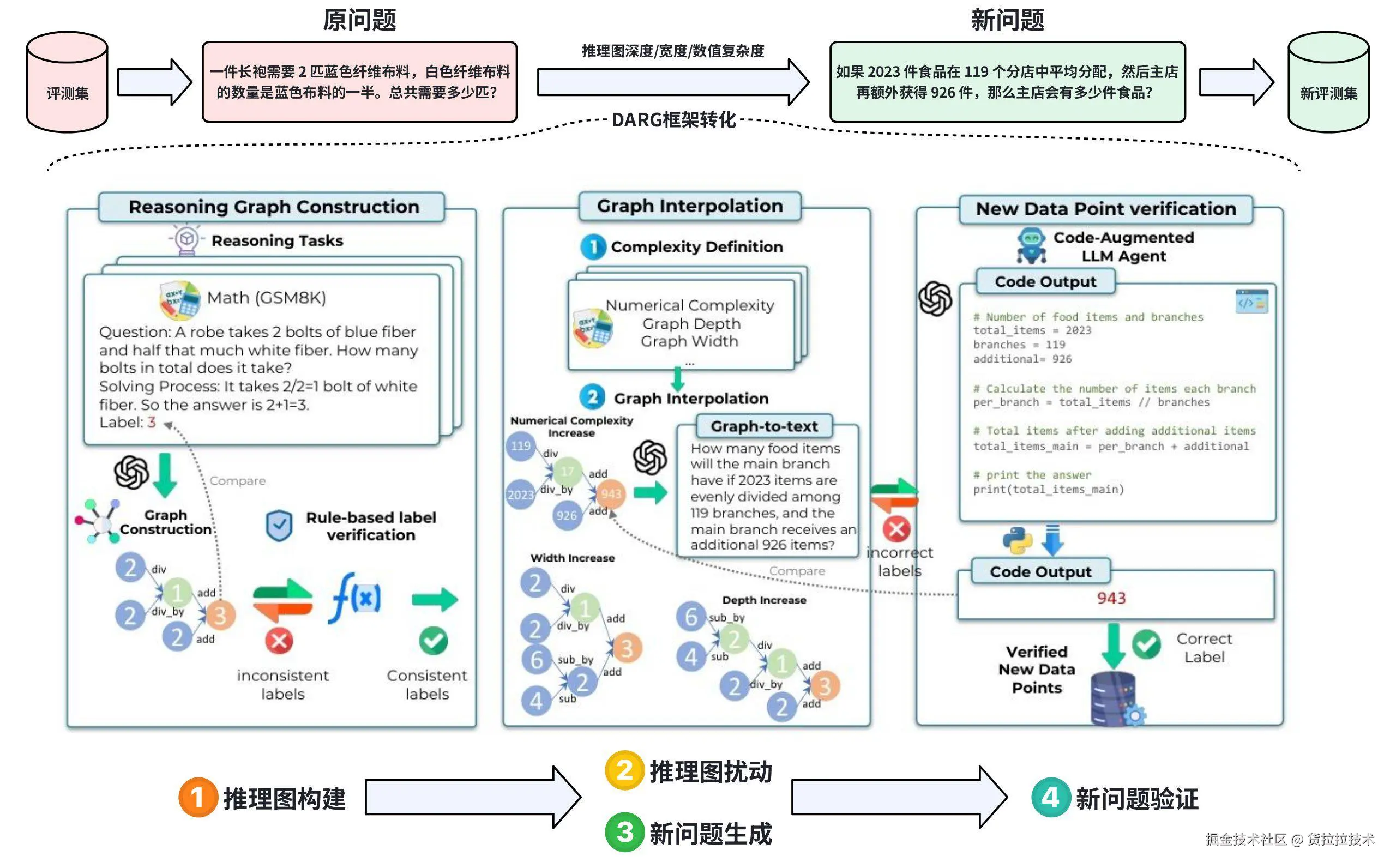 DARG框架:从原评测题出发,经推理图构建、复杂度扰动、新问题生成等动态生成高质量新评测题(图片来源:https://arxiv.org/abs/2406.17271)