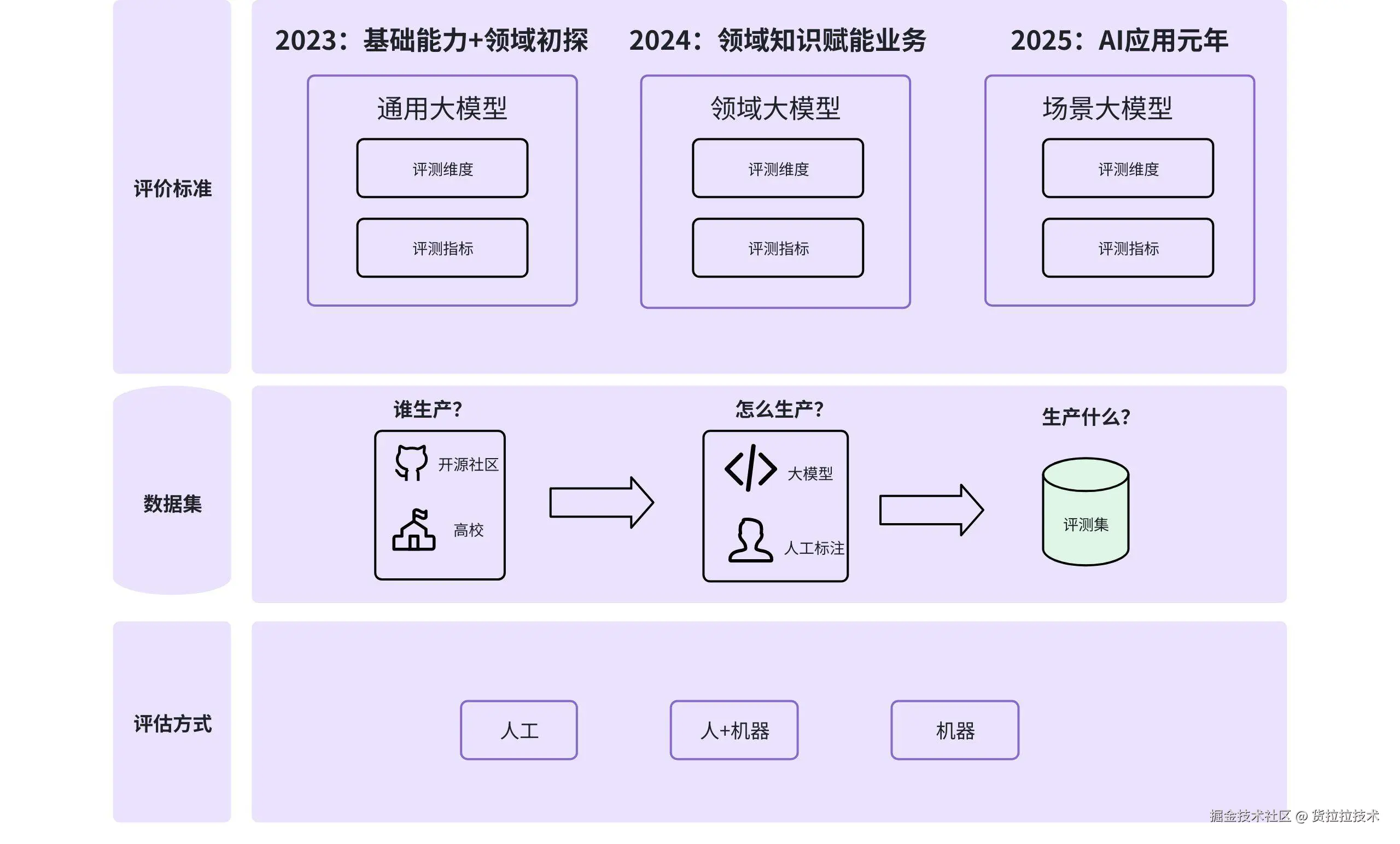 - 评测什么 :主要是大模型的通用能力 (2023年,摸索智商边界,类似9年义务教育)、领域能力 (2024年,培养专业的技能,类似于大学分专业教育)、场景能力(2025年,主攻重商业价值。公司的岗位培训,如客服、营销、数据等)。