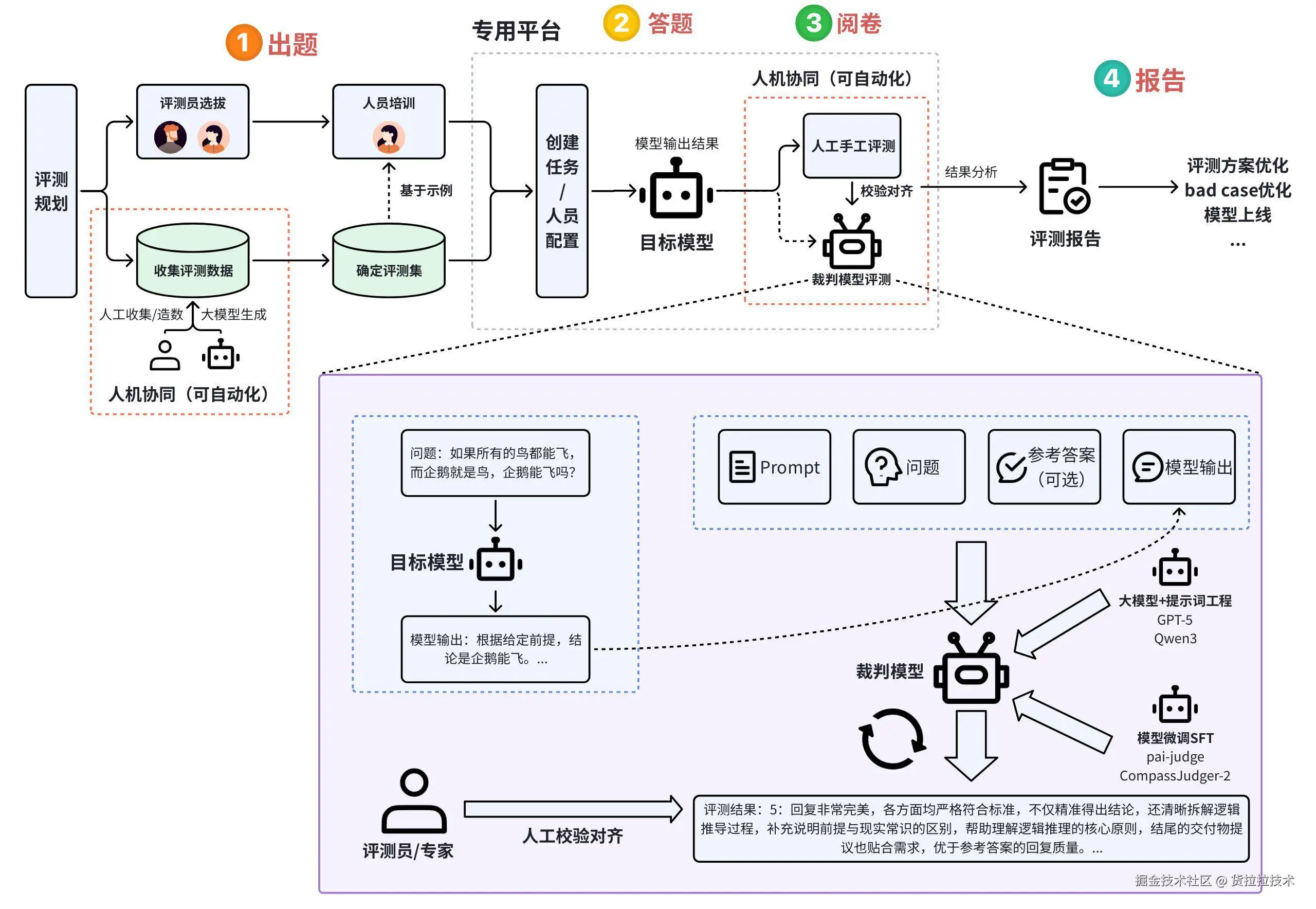 人机协同评测全流程图,模型参与"出题"与"阅卷"阶段,辅助提升评测质量与效率