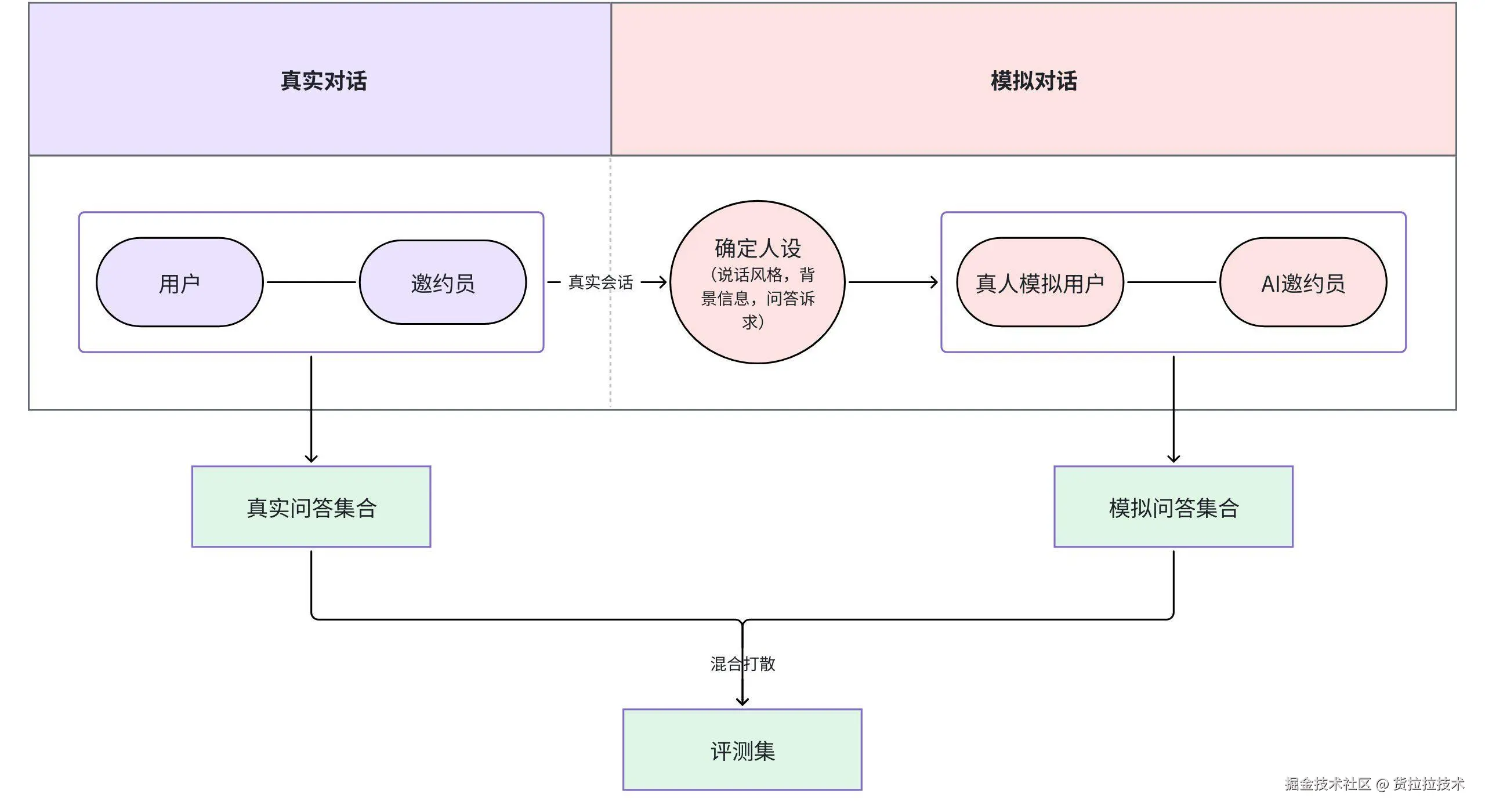 评测集构建流程:通过模拟真实用户,确定人设并与AI邀约员对话形成模拟问答集,通过与真实数据混合方式构建最终评测集