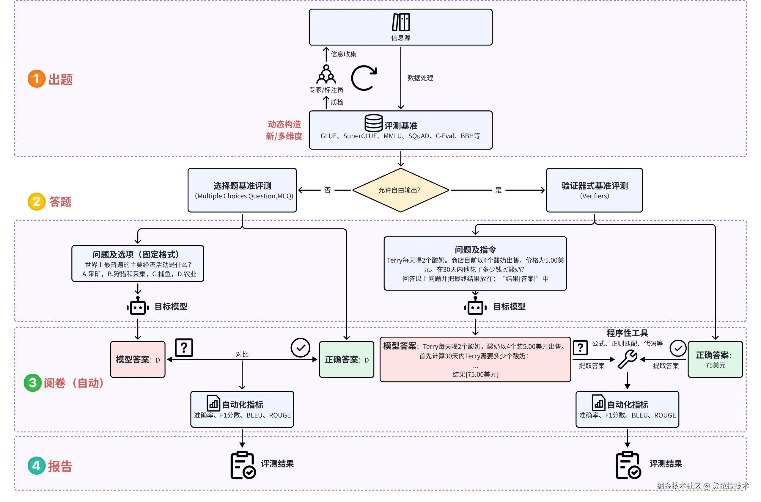 评测形式 :根据模型是否自由输出 ,分为选择题基准 和验证器式基准评测(如数学、编程领域)