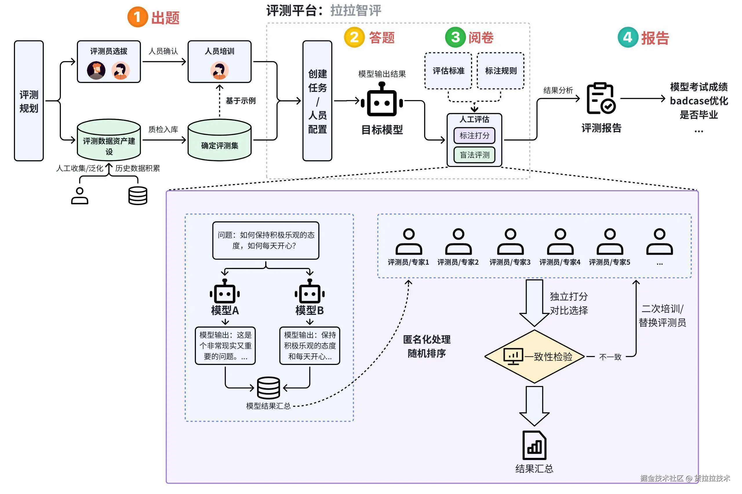 基于系统化的评测方案,确定评测人员及评测集,经过规范化的人工评估形成最终评测结果。