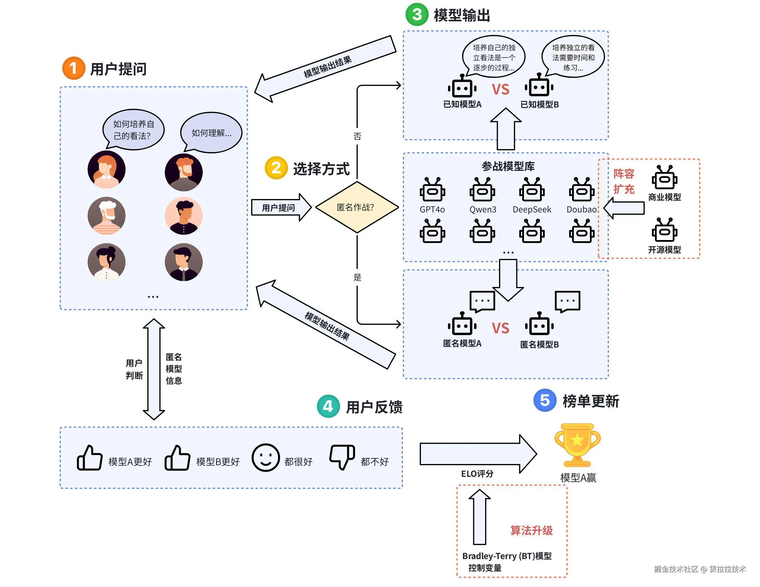 采用众包人工评估方式,对比同一问题多模型输出结果并进行实时投票,最终依据统计指标动态更新排名榜单。