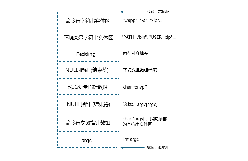 当程序被执行时,操作系统会为新进程分配内存。在进程的**栈(Stack)**的高地址部分,布局通常是这样的(栈由高地址向低地址生长):