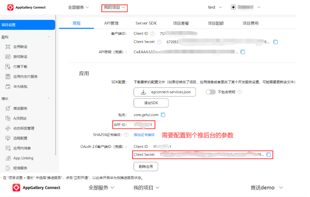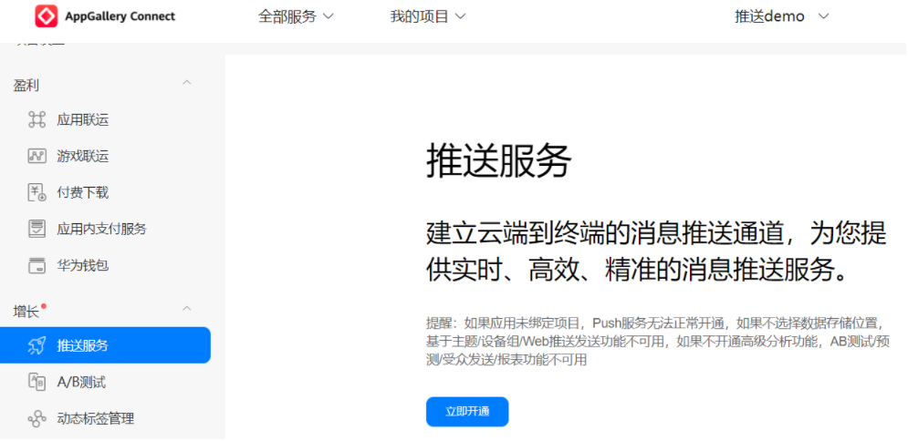 访问https://developer.huawei.com/consumer/cn/service/josp/agc/index.html#/myProject,点击项目,在项目设置中添加项目,添加项目后,点击推送服务,点击开通