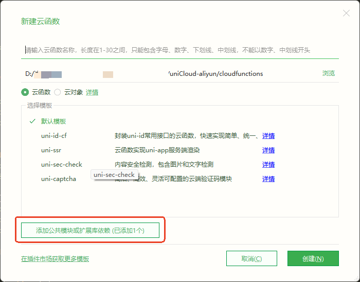 访问https://unicloud.dcloud.net.cn/,登录后新建,此处我选择的阿里云