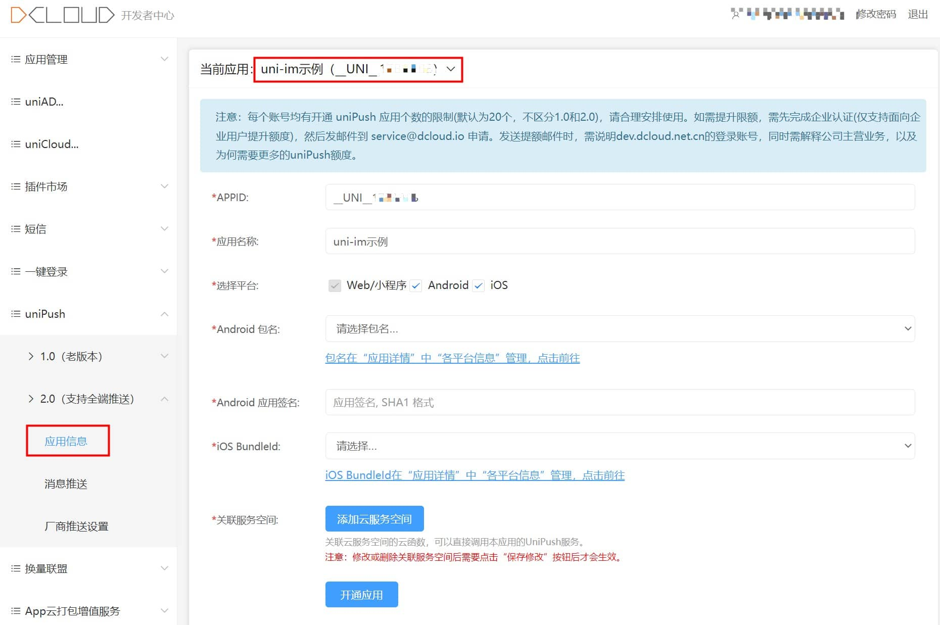 创建后,回到dcloud,关联云空间,填好信息,点击开通应用