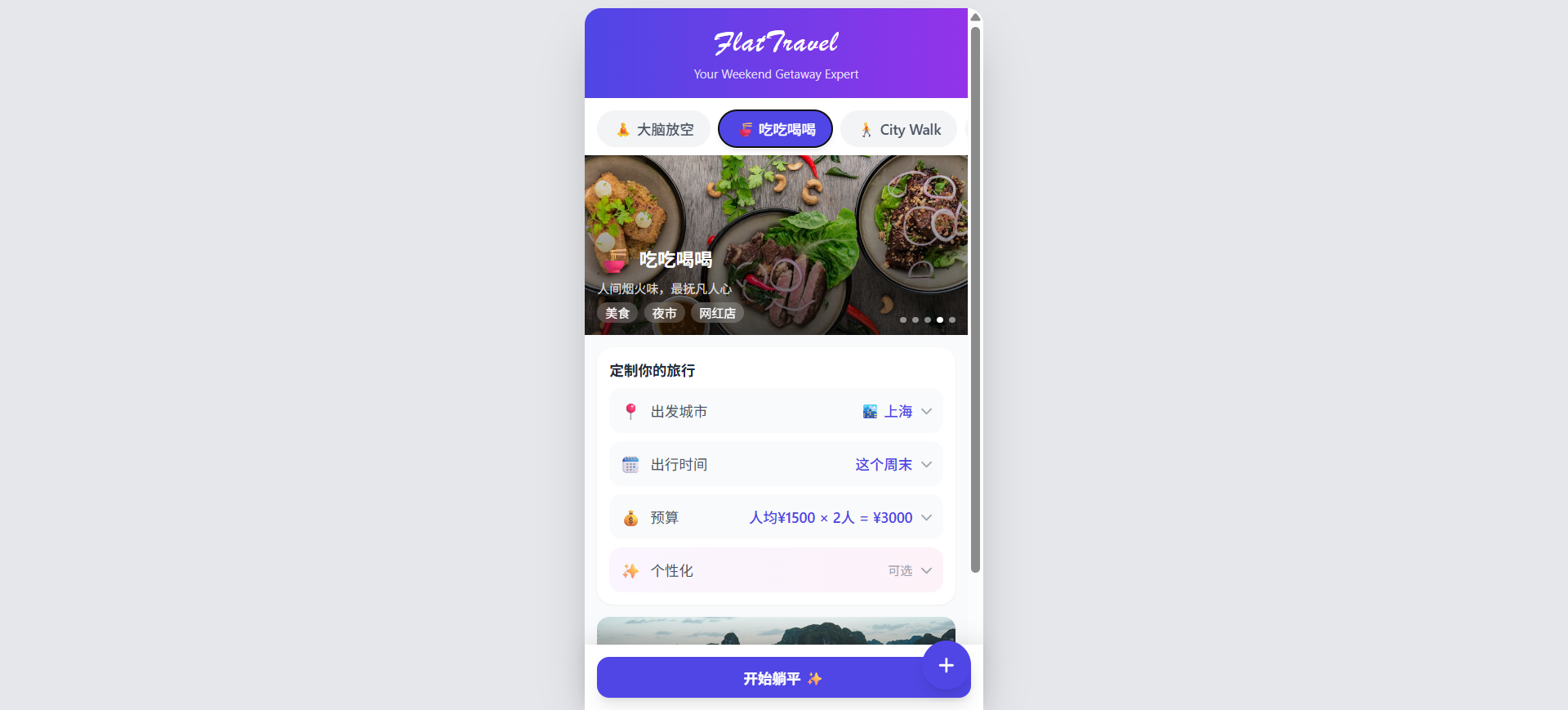 躺平旅行 Flatravel是一款面向上班族的周末旅行规划助手,借助大模型和未来的真实用户信息和大数据,核心解决"决策疲劳"和"时间焦虑"问题。核心就是:将原本几小时的攻略准备时间压缩到几分钟之内,不再为上班族增加心智负担。 -