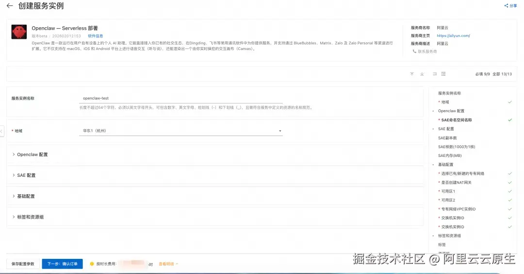 - 服务实例名称:自定义,如 openclaw-test
