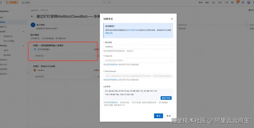 在连接流账号授权配置向导页,点击钉钉应用机器人下的添加新凭证,填入创建的应用的 Client ID 和 Client Secret,并设置一个自定义凭证名称。