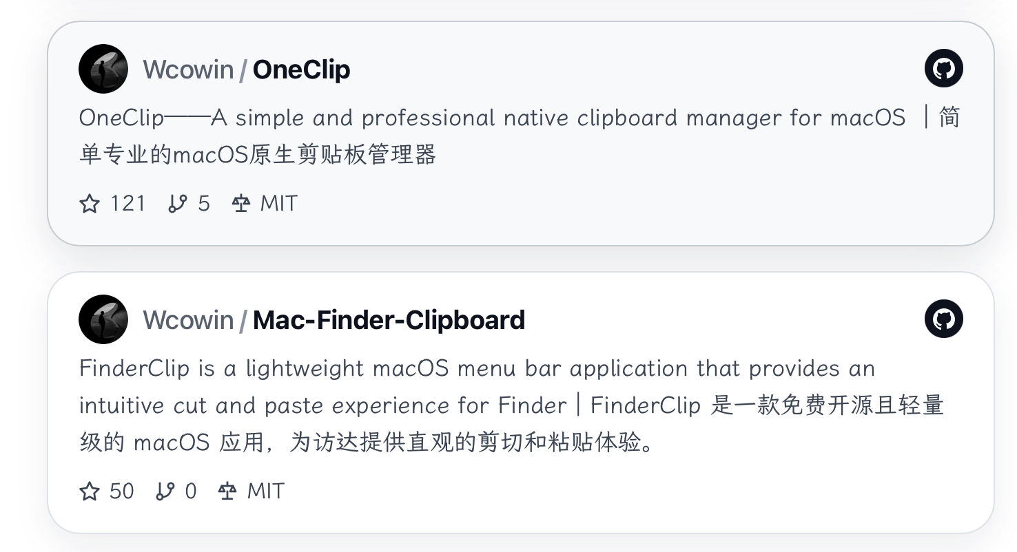 oneclip-github-card→foo-bar-github-cardoneclip-avatar→foo-bar-avataroneclip-stars/oneclip-forks/oneclip-license→ 对应新 idWcowin/OneClip→ 仓库实际所有者和名称https://api.github.com/repos/Wcowin/OneClip/https://github.com/Wcowin/OneClip→ 你的仓库地址