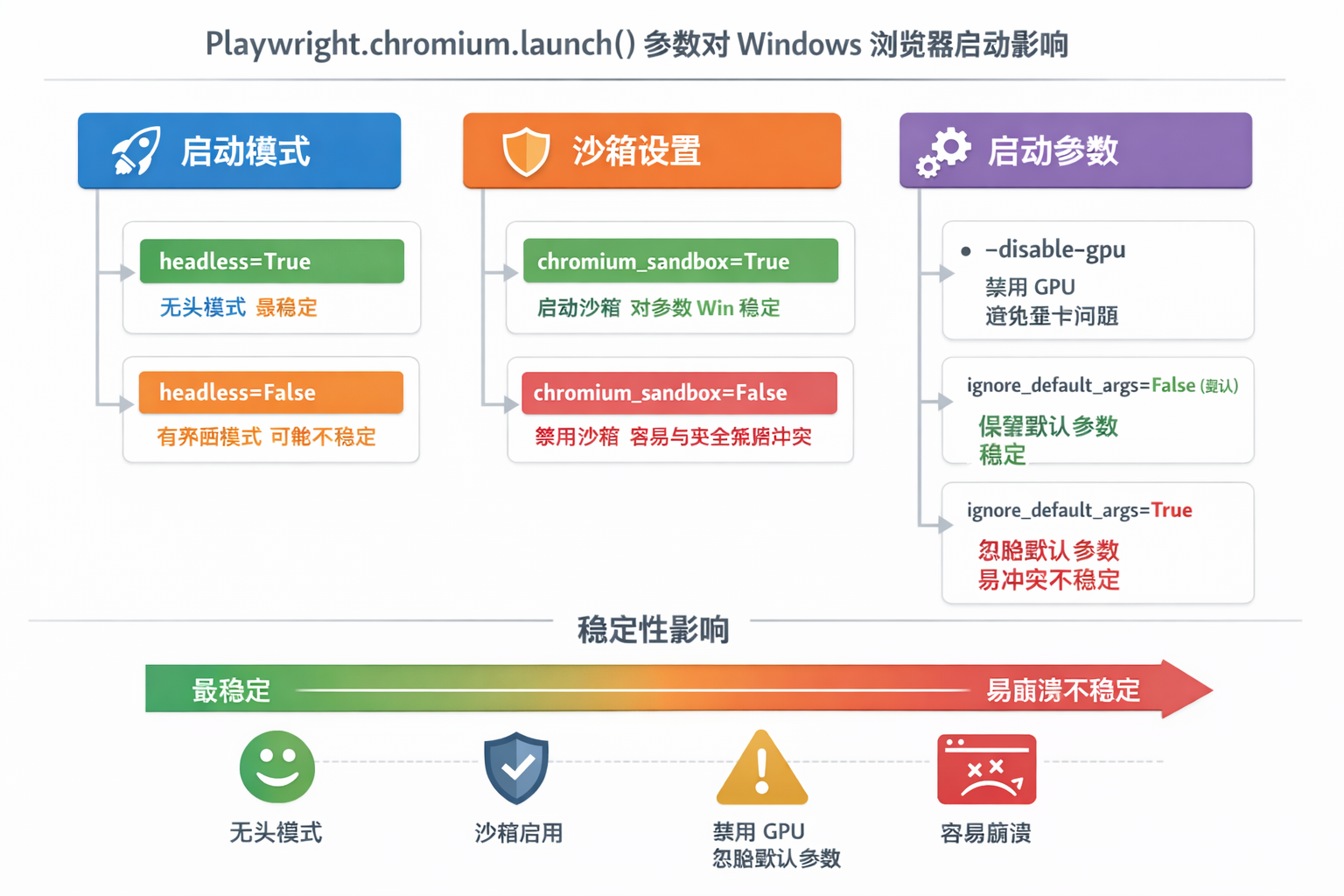 沙箱启用/禁用 | 对 Windows headful crash 高度相关;不同环境沙箱状态不同,可能是你开启后就能稳定运行的关键 |