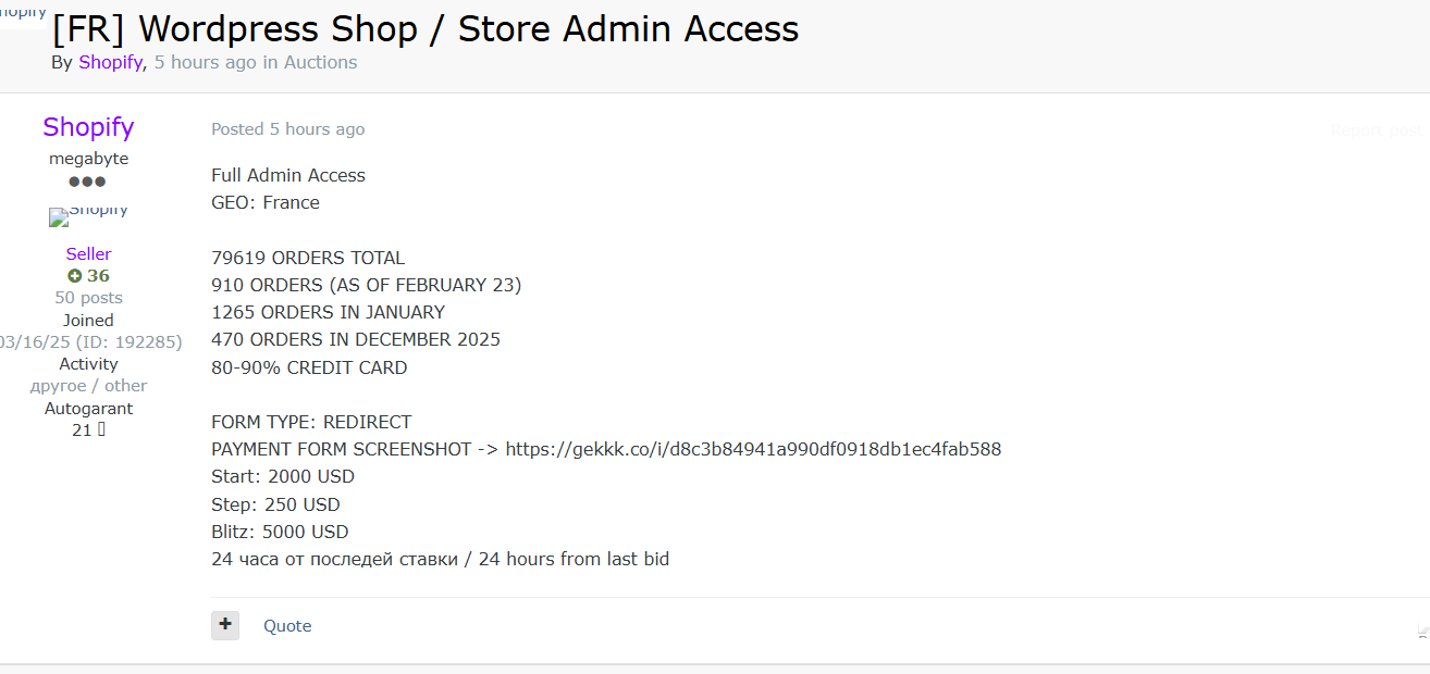 威胁行为者公开拍卖法国一家基于 WordPress 搭建的在线商店完整管理员权限,起拍价 2000 美元,闪电成交价 5000 美元。据卖家声称,该商店累计订单达 79619 笔,其中 80%-90% 的交易通过信用卡支付,交易活跃度较高,2025 年 12 月处理订单 470 笔、2026 年 1 月 1265 笔、2 月至今 910 笔;其支付表单采用重定向方式,存在潜在安全漏洞,目前权限已在地下渠道公开竞价,风险极高。