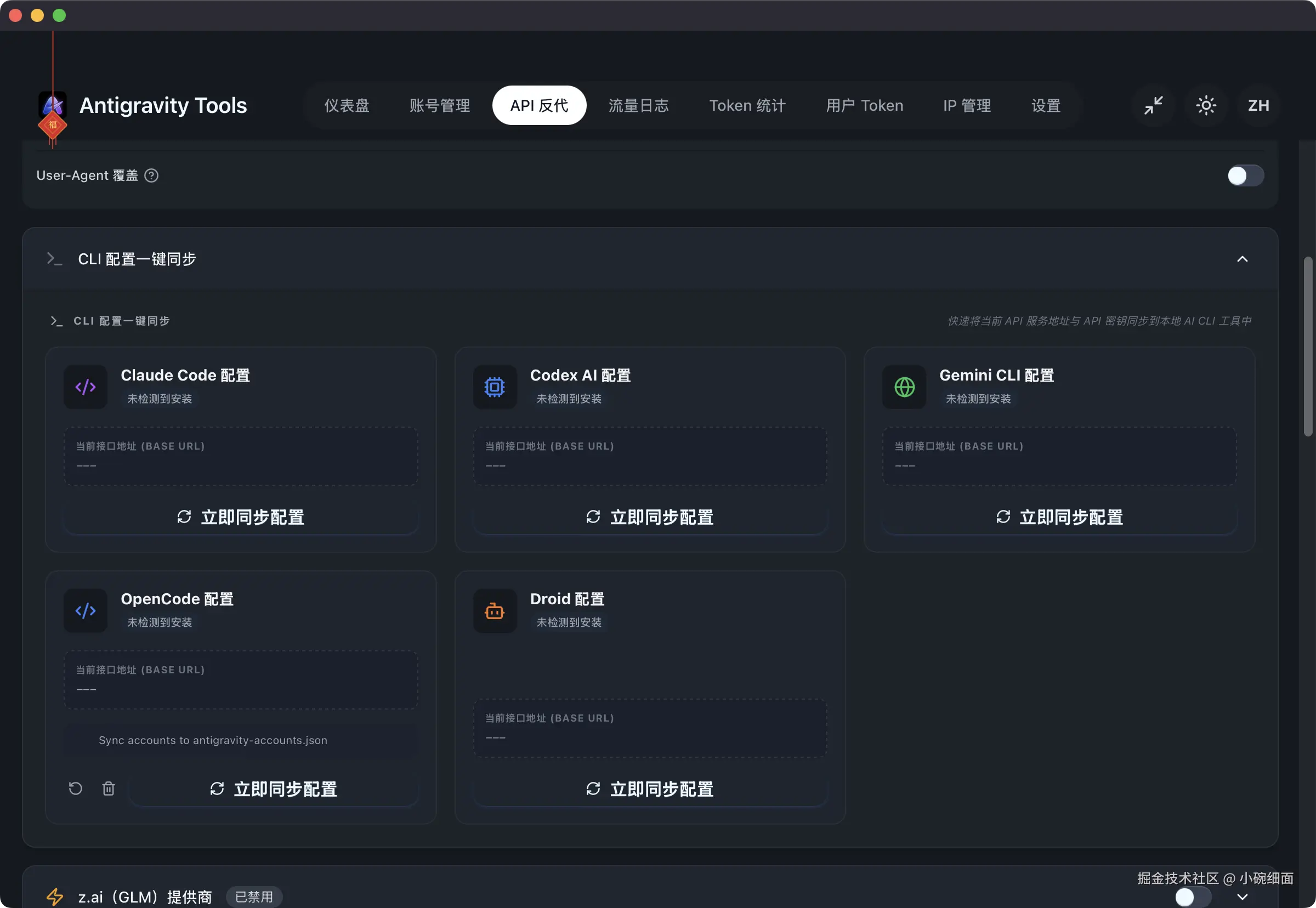- 确认 Antigravity Tools 的 API 反代服务已启动
