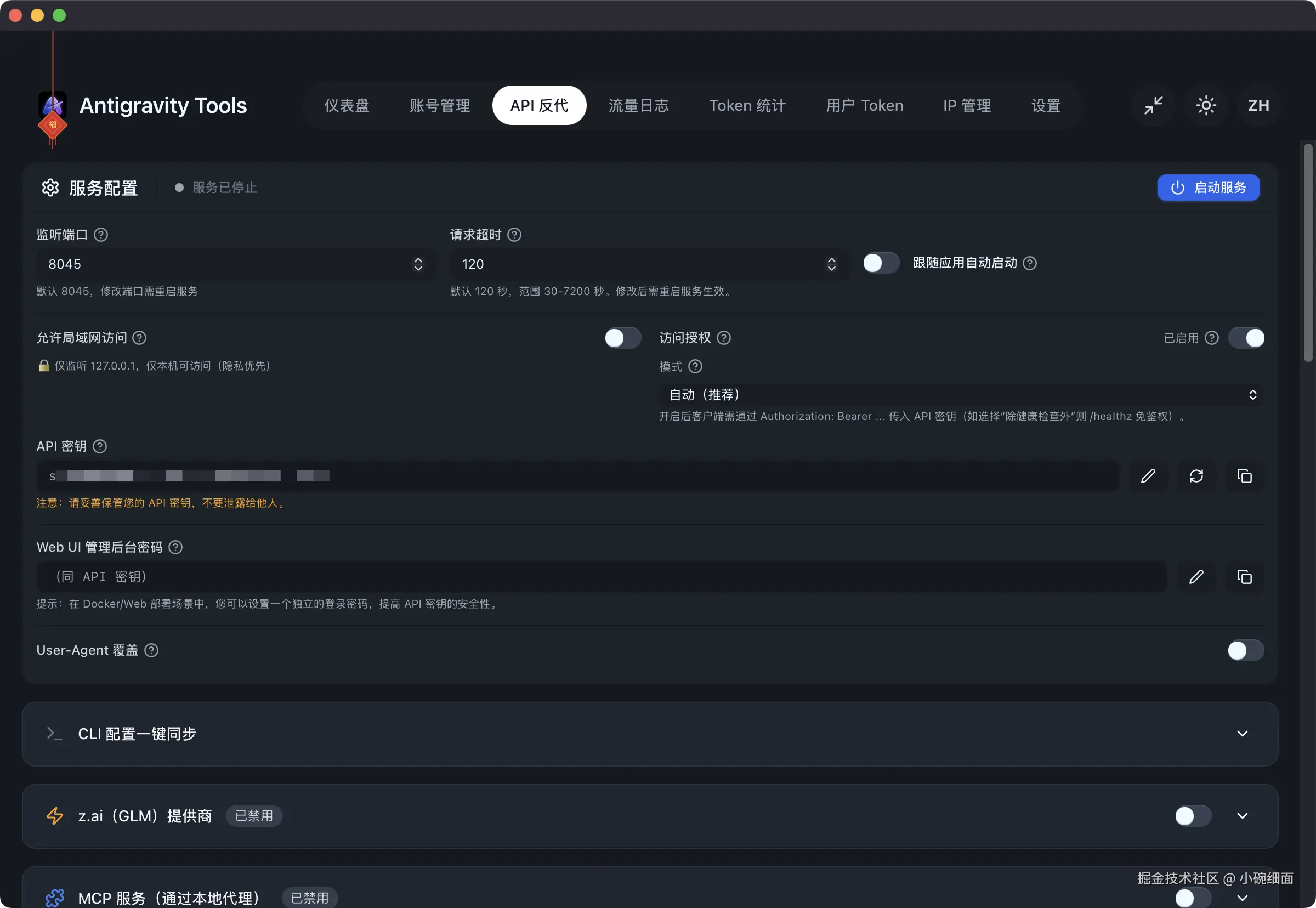 步骤 1 : 启动 Antigravity Tools,确保 API 反代 服务已开启