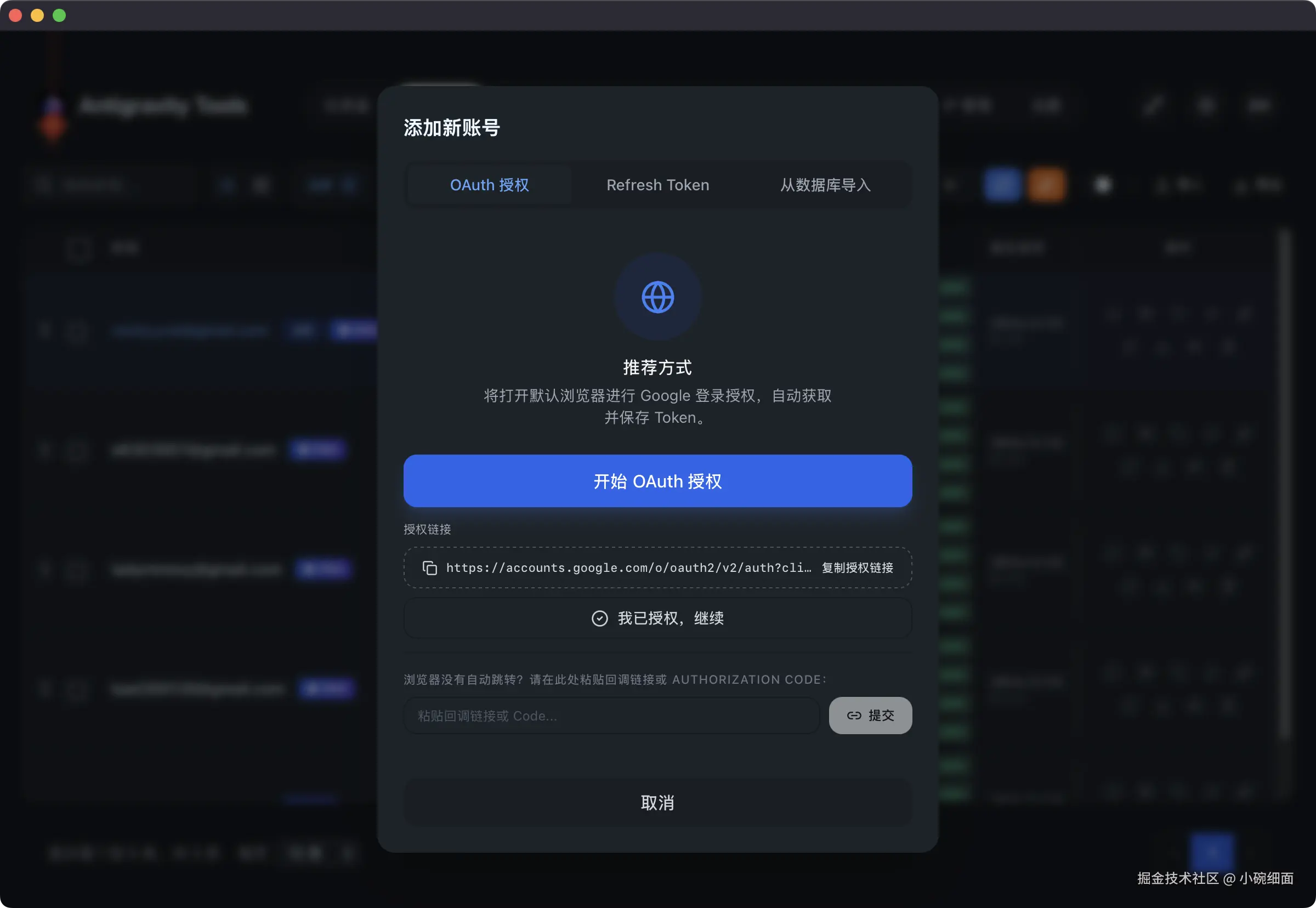 - 打开 Antigravity Tools,进入 Accounts(账号) 页面