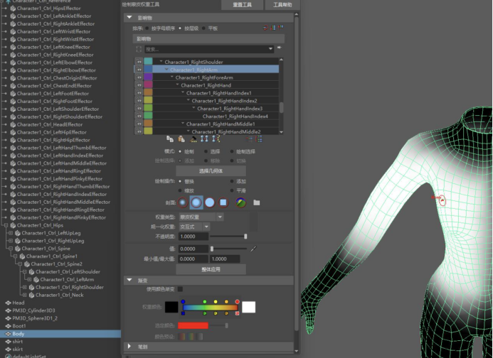 控制器形状与颜色规范:Maya中常用NURBS圆形、方形、箭头、圆环等曲线作为控制器。形状要直观、易识别、不遮挡模型,比如躯干用圆形、根骨用方形、方向控制用箭头。颜色通常遵循行业惯例:左臂、左腿为蓝色,右臂、右腿为红色,躯干与头部为黄色,可帮助动画师快速区分左右与功能模块,提升操作效率。