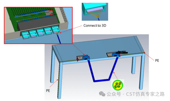 方法一,"PCB+结构+cable工作室建模"+ 3D Combine方法,如下图所示。这种方法把PCB、结构、cable模型放在一起建模,cable模型与PCB之间通过"Connect to 3D"实现连接,利用时域T求解器计算完整的S参数矩阵,然后在Schematic中进行3D Combine,得到远场RE结果。