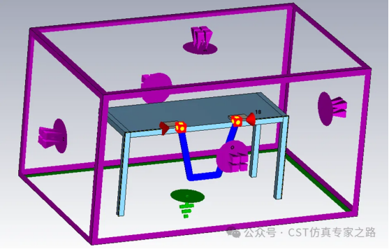 RE测试的场地是半电波暗室,是在电磁屏蔽室的基础上,在墙面及天花板上贴装吸波材料,地面为理想的反射面,从而模拟开阔场地的测试条件。为了模拟半电波暗室,地面设置为电边界,其他为Open边界。测试设备(EUT)和辅助设备(AE)的布置要与实际保持一致,cable的长度和布置也要与实际一致。