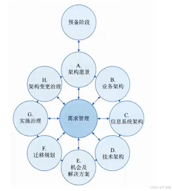 架构开发方法(ADM)为开发企业架构所需要执行各个步骤以及它们之间的关系进行详细的定义,同时它也是 TOGAF 规范中最为核心的内容。ADM架构开发包括十个阶段: