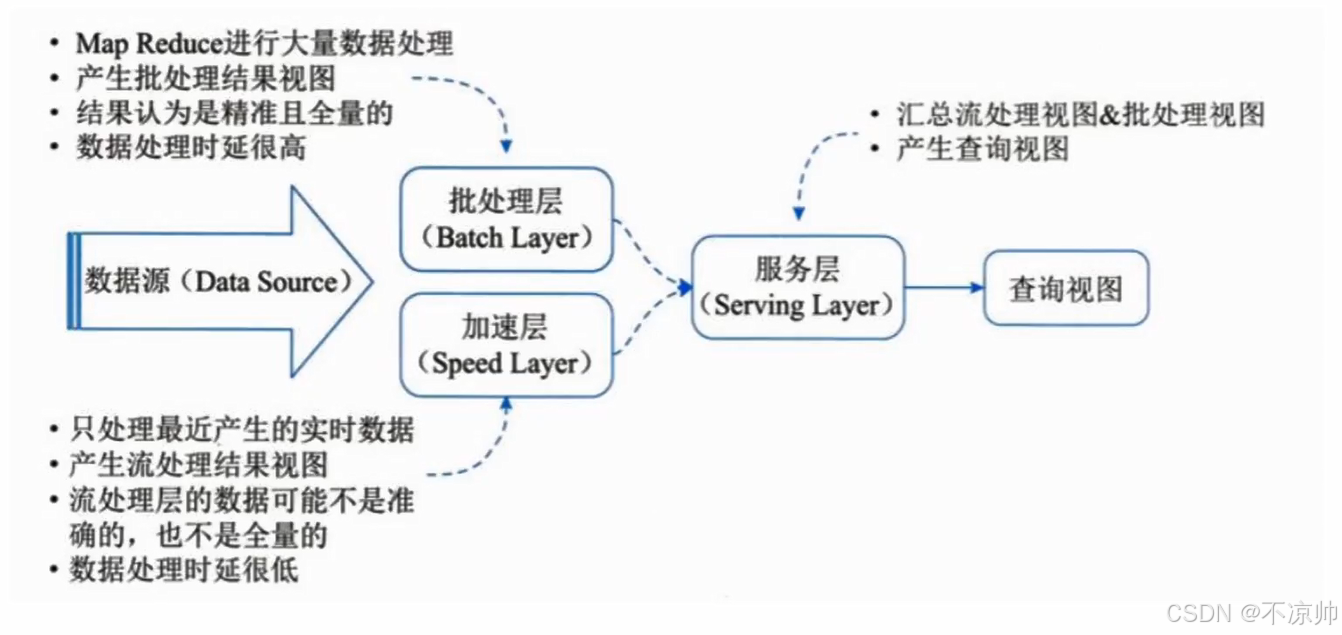 ① 实时层 :核心功能为处理输入数据并生成实时视图。具体通过流式处理引擎逐条处理输入数据来实现,架构实现上采用Apache Kafka回访数据,再用Flink或Spark Streaming处理。
