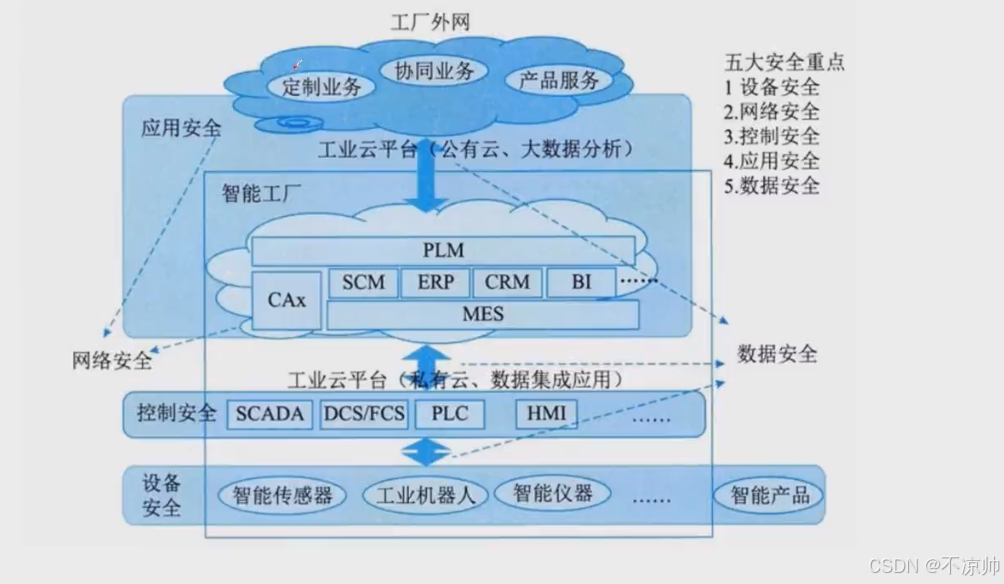 在设计基于混合云的工业安全生产管理系统时,需要考虑安全问题有:设备安全、网络安全、控制安全、应用安全和数据安全。