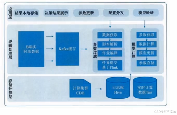 (3)数据存储:Flink 将计算结果转储至 Hive 日志库,将模型需要的参数转储至实时计算数据库 Tair 缓存,然后后续决策服务从 Tair 中获取数据进行模型训练。