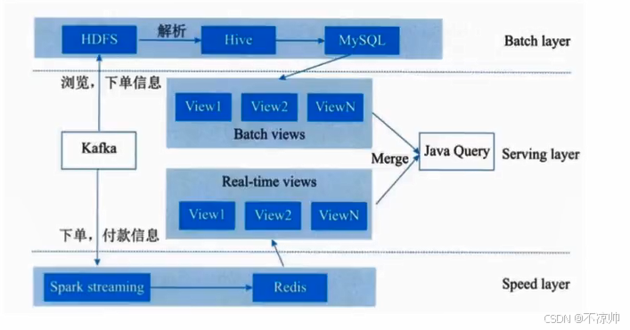 (1)批处理层:每天凌晨将 Kafka 中浏览、下单等消息同步到 HDFS 中,将 HDFS 中数据解析为 Hive 表,然后使用 HQL 或 Spark SQL 计算分区统计结果 Hive 表,将 Hive 表转储到 MySQL 中作为批视图。